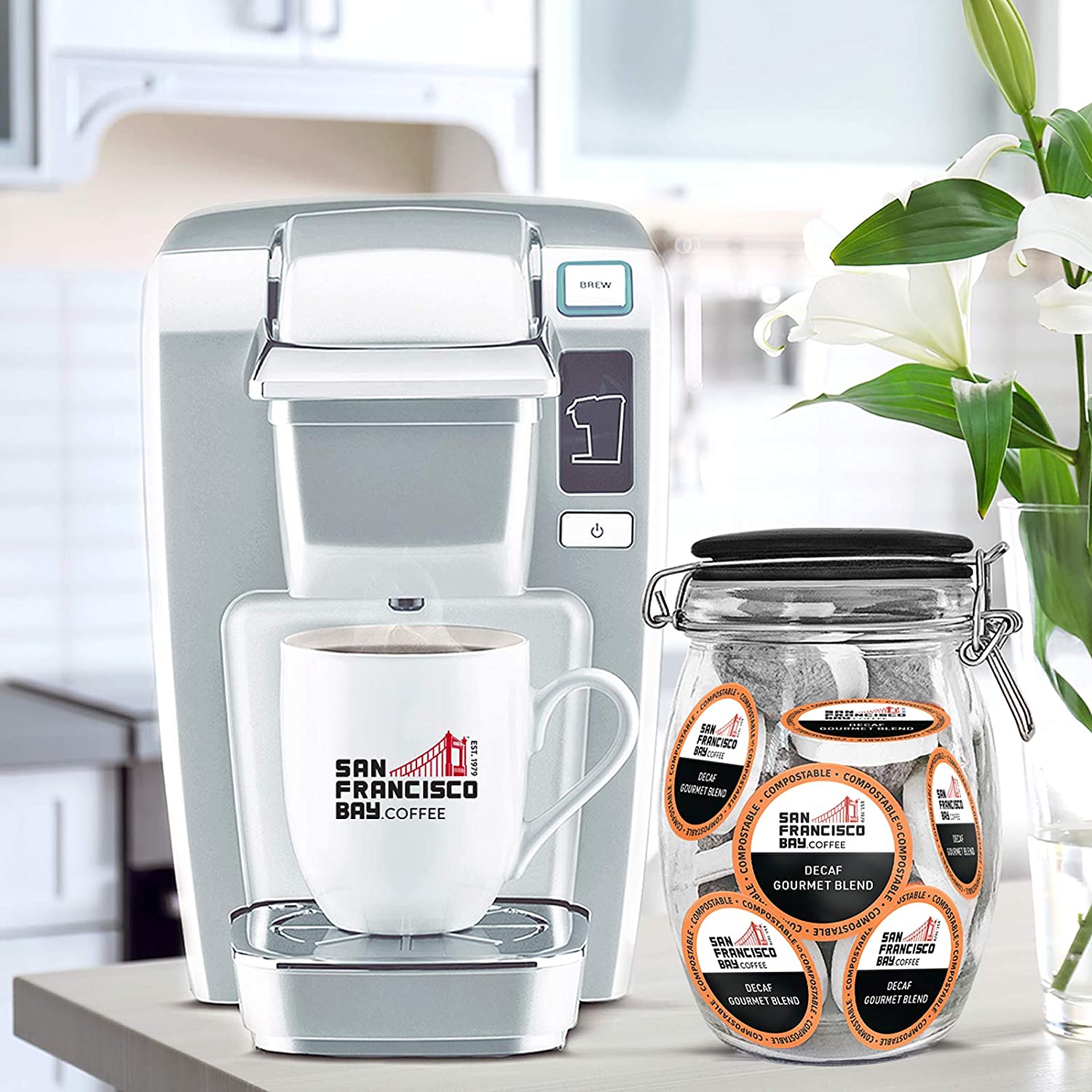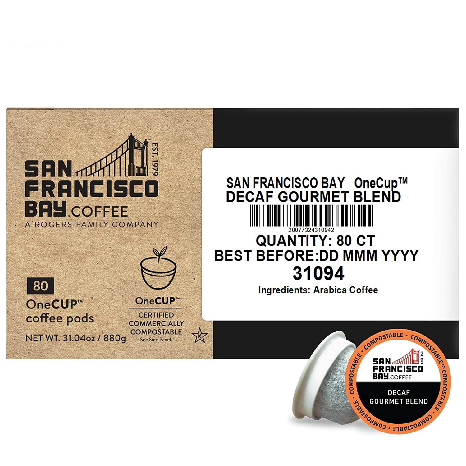 SAN FRANCISCO BAY Coffee OneCUP DECAF Gourmet Blend 80 Ct Natural Water Processed Dark Roast Compostable Coffee Pods. K Cup Compatible including Keurig 2.0