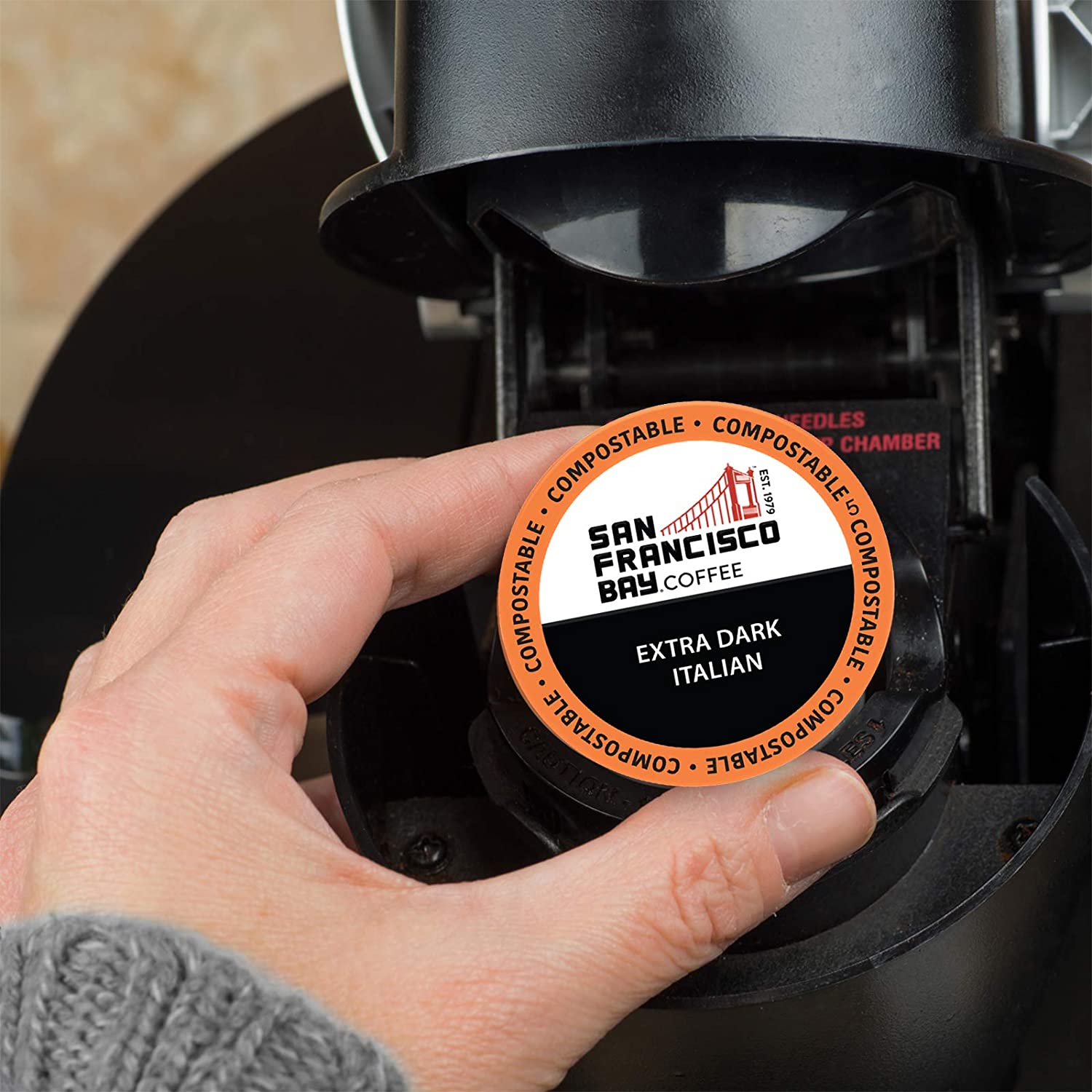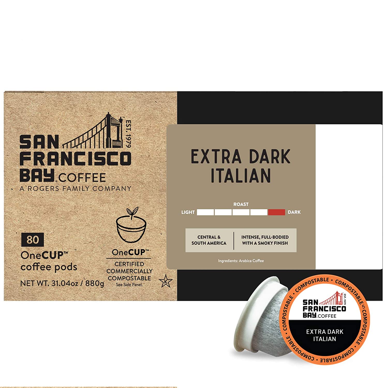 SAN FRANCISCO BAY Coffee OneCUP Roast Extra Dark Roast Compostable Coffee Pods. K Cup Compatible including Keurig 2.0 (Packaging May Vary). Extra Dark Italian. 80 Count (Pack of 1)