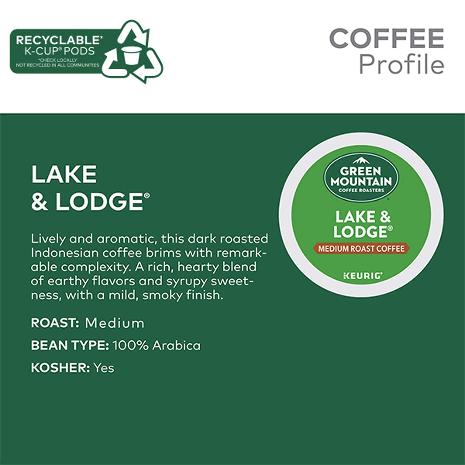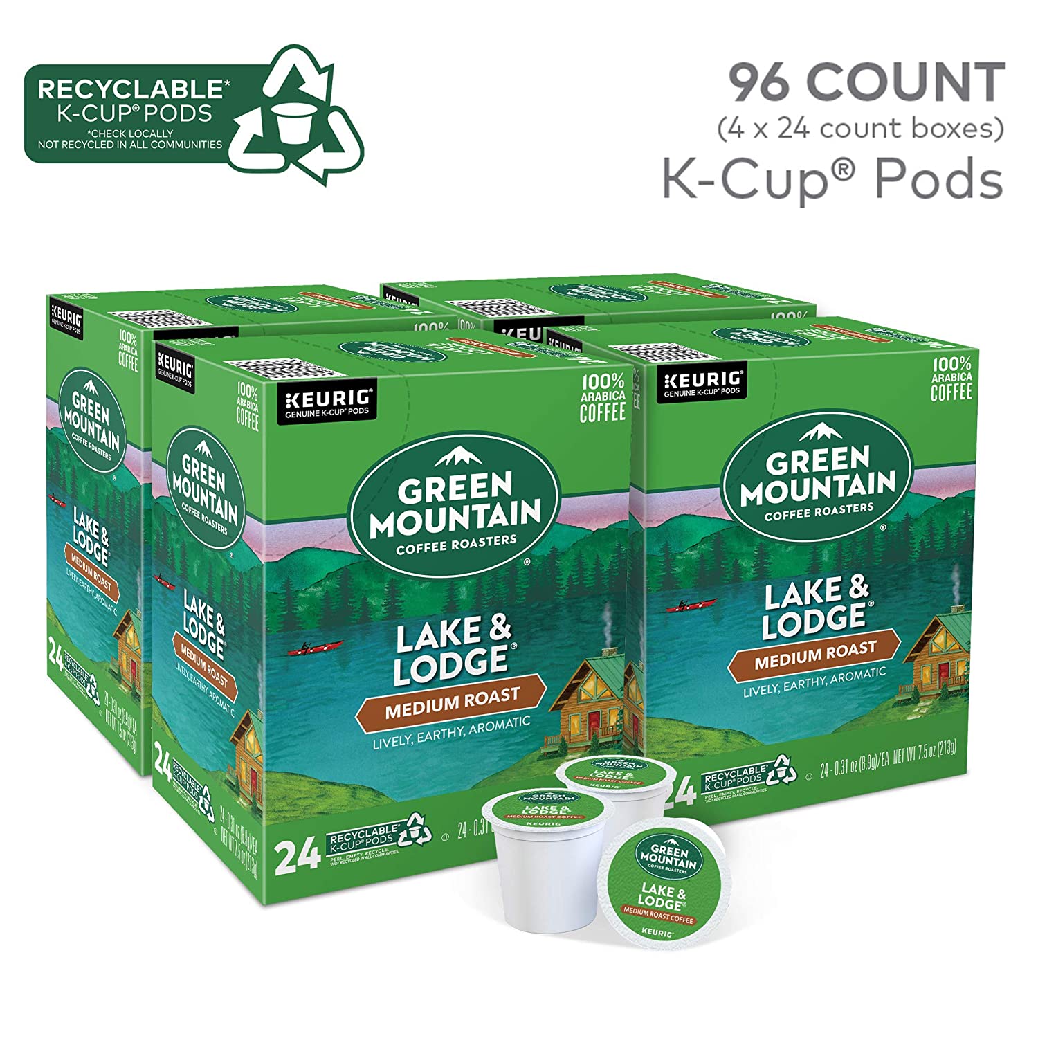 Green Mountain Coffee Roasters Lake & Lodge. Single-Serve Keurig K-Cup Pods. Medium Roast Coffee Pods. 96 Count