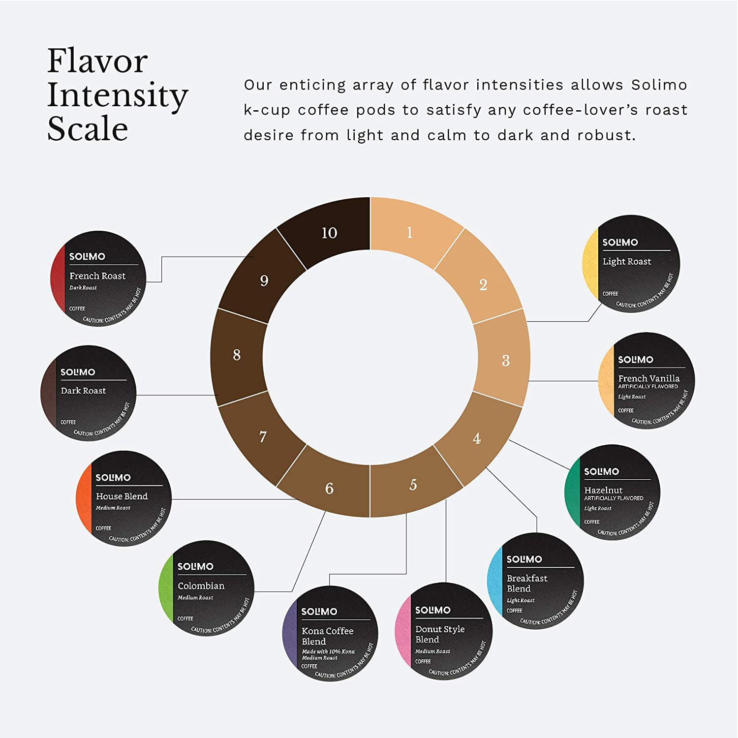 Solimo Medium and Dark Roast Coffee Pods Assorted pack (French. Dark. Colombian) single serve cups. 100 ct