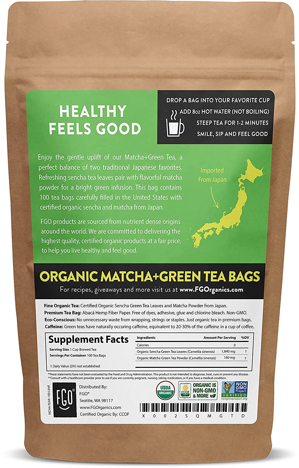 FGO Organic Japanese Matcha + Green Tea Bags 100 Tea Bags Eco-Conscious Tea Bags in Kraft Bag