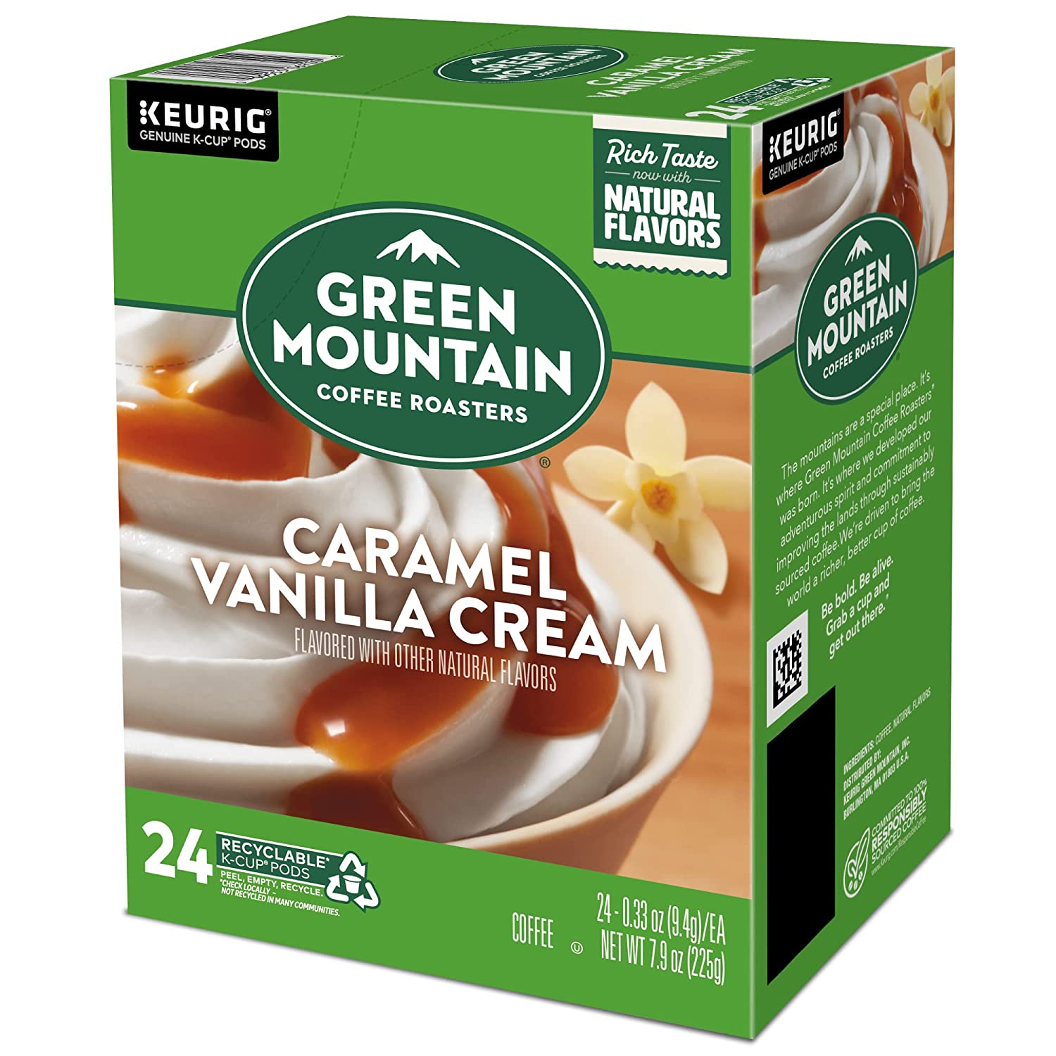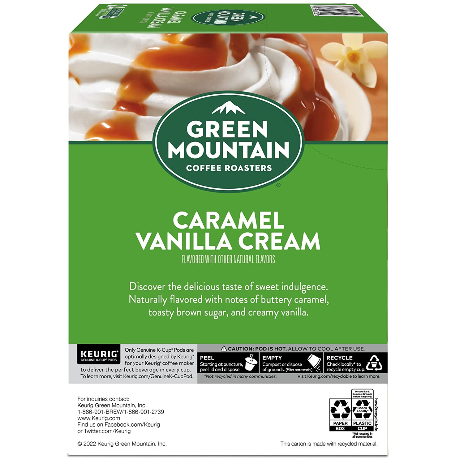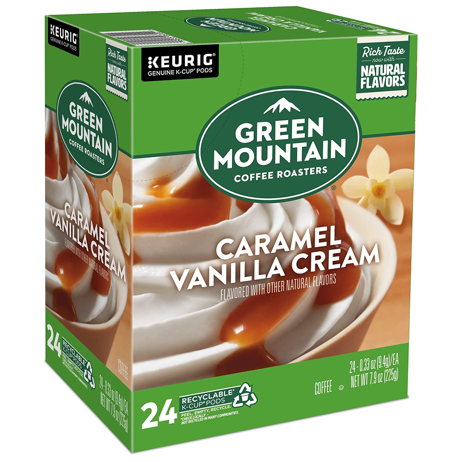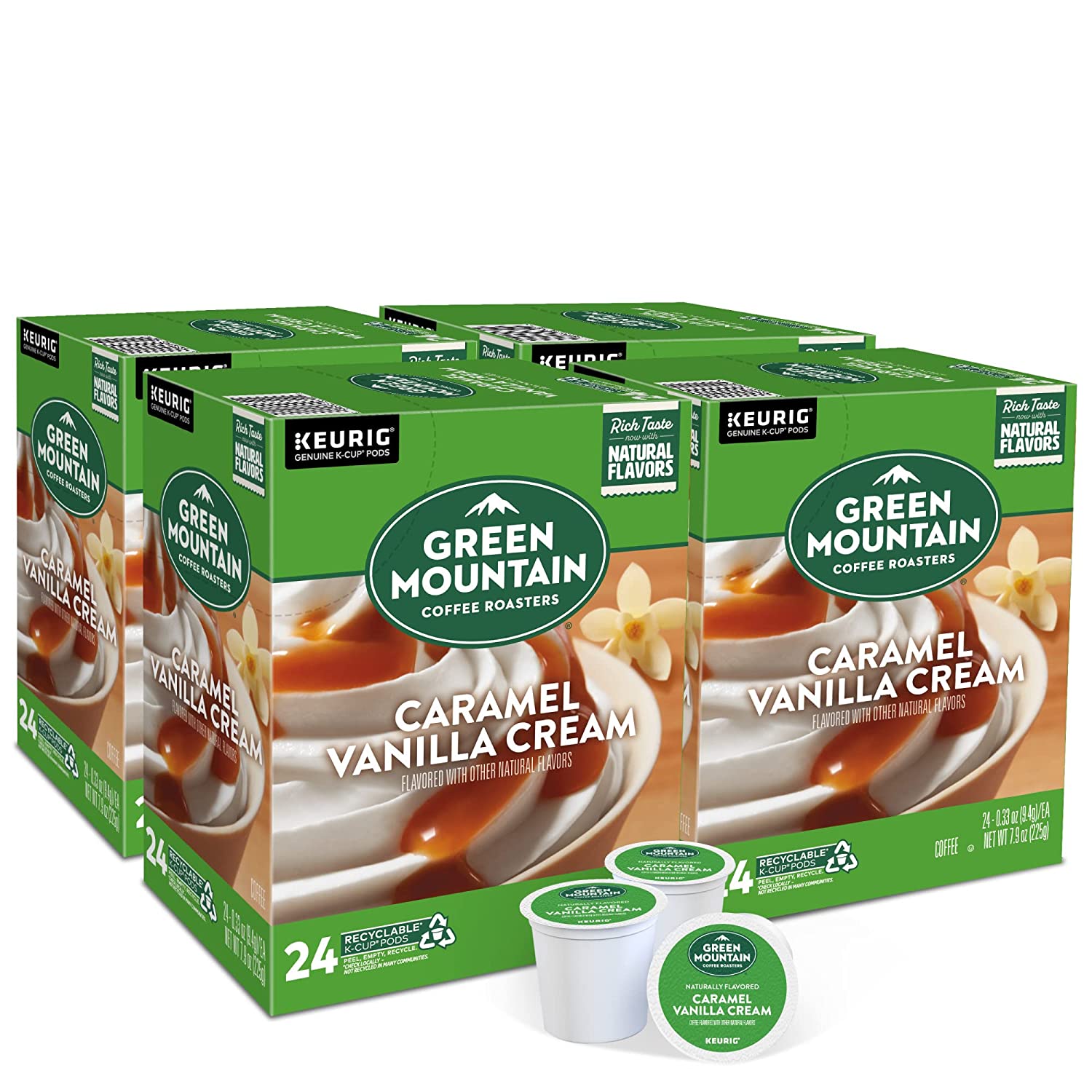 Green Mountain Coffee Roasters Caramel Vanilla Cream. Single-Serve Keurig K-Cup Pods. Flavored Light Roast Coffee. 96 Count