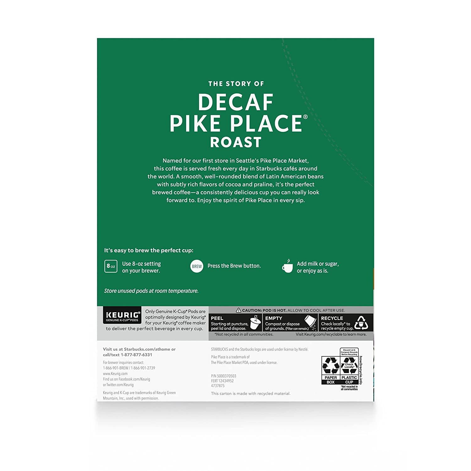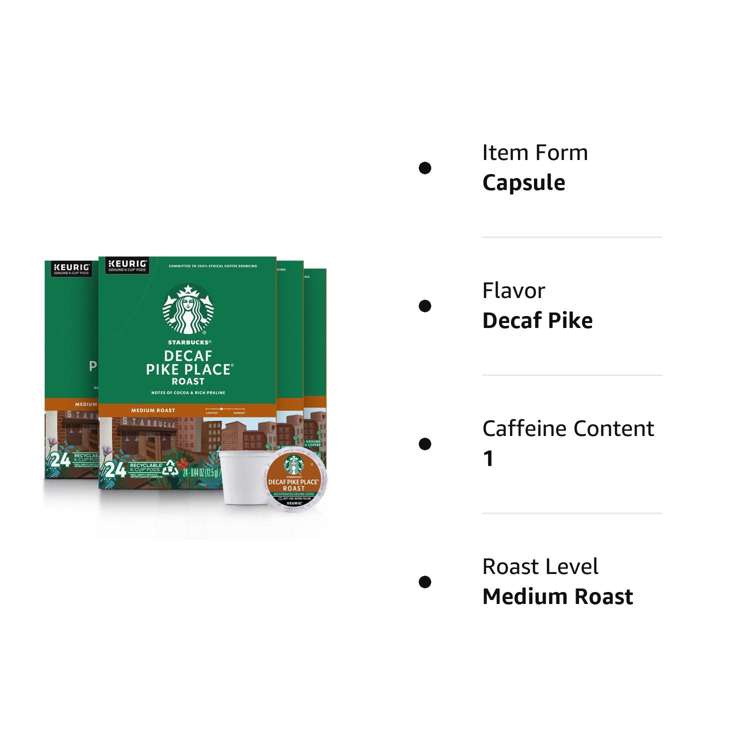 Starbucks K-Cup Coffee Pods. Medium Roast Coffee. Decaf Pike Place Roast. 100% Arabica. 4 boxes (96 pods total)
