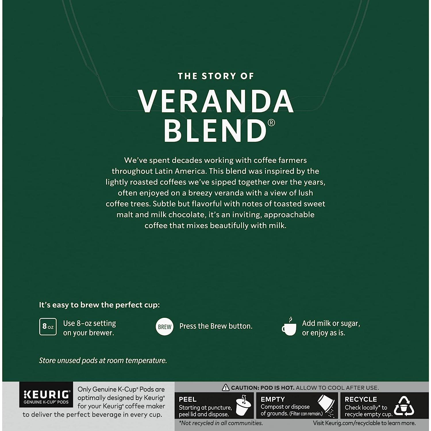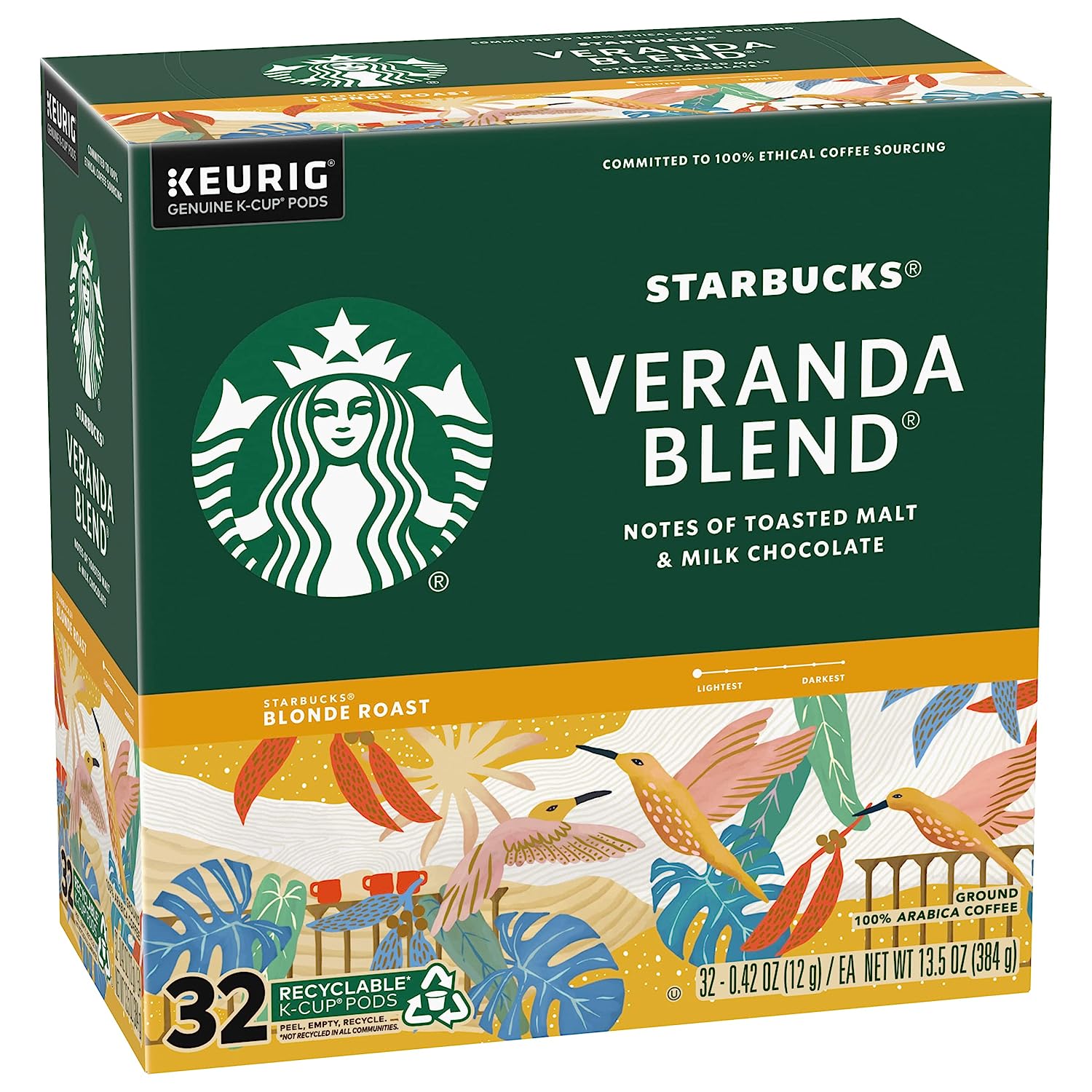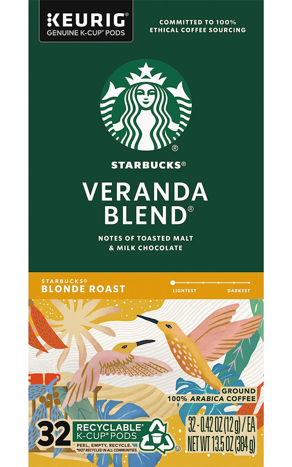 Starbucks Coffee K-Cup Pods. Veranda Blend. Blonde Roast Coffee. Notes of Toasted Malt & Milk Chocolate. Keurig Genuine K-Cup Pods. 32 CT K-Cups/Box (Pack of 3 Boxes)