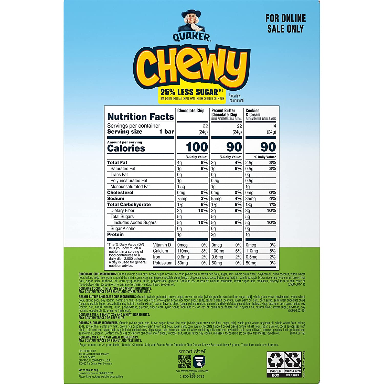Quaker Chewy Lower Sugar Granola Bars. 3 Flavor Less Sugar Variety Pack 58 Count (Pack of 1)