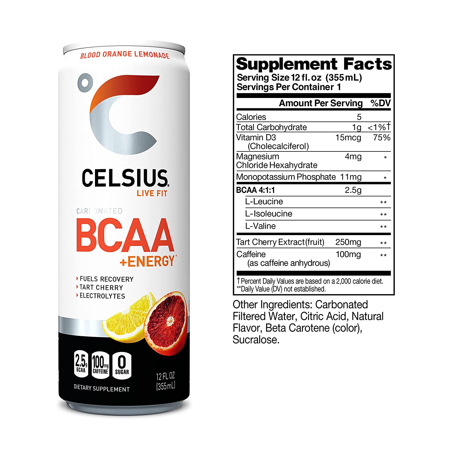 CELSIUS BCAA +Energy Sparkling Post-Workout Recovery & Hydration Drink. Slim Can. Blood Orange Lemonade. 12oz (Pack of 12). 144 Fl Oz