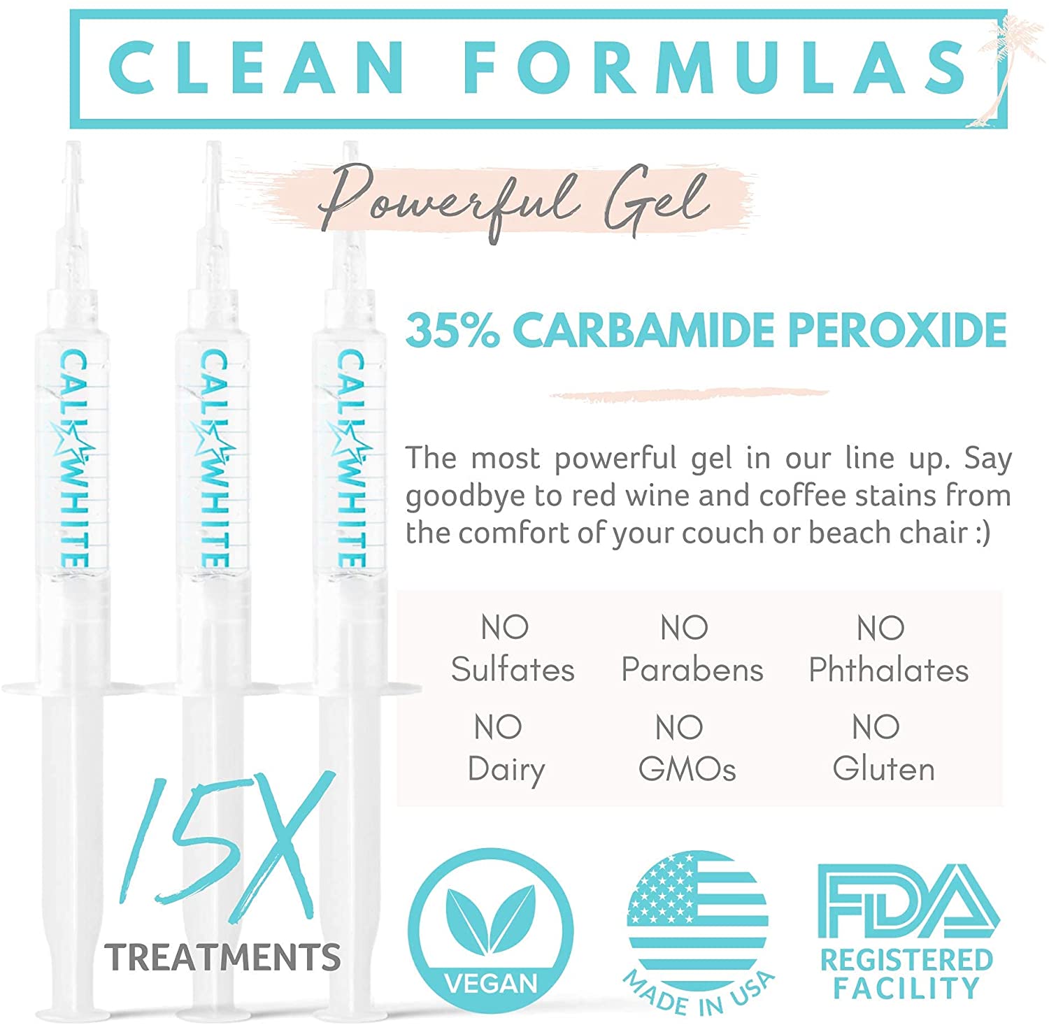 Cali White Teeth Whitening Gel Refills. 35% Carbamide Peroxide. Gels Made in USA. 3X 5mL Syringes