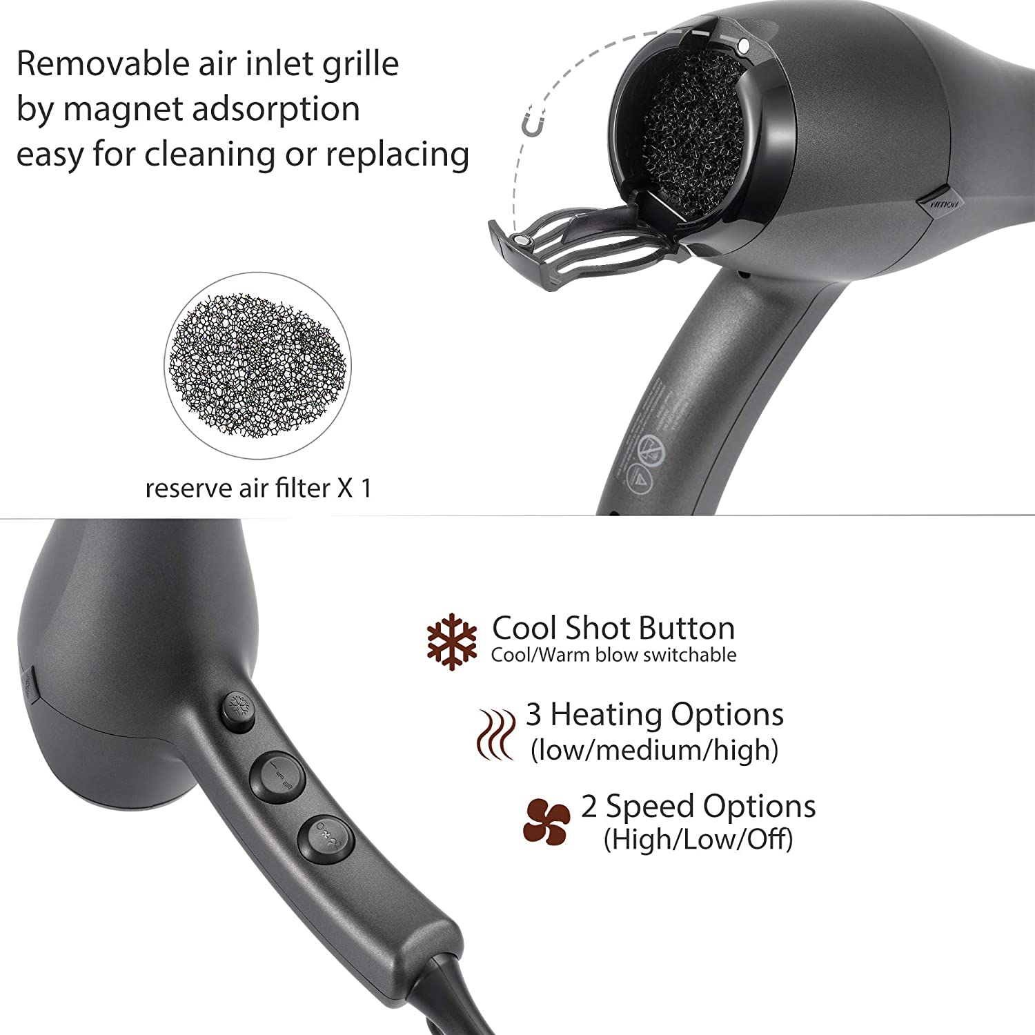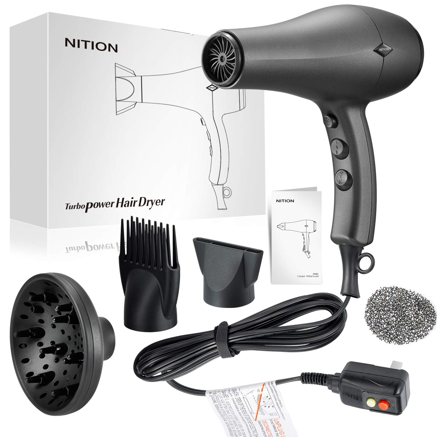 NITION Ceramic Hair Dryer with Diffuser.Comb & Nozzle Attachments. Cool Shot Button.Black