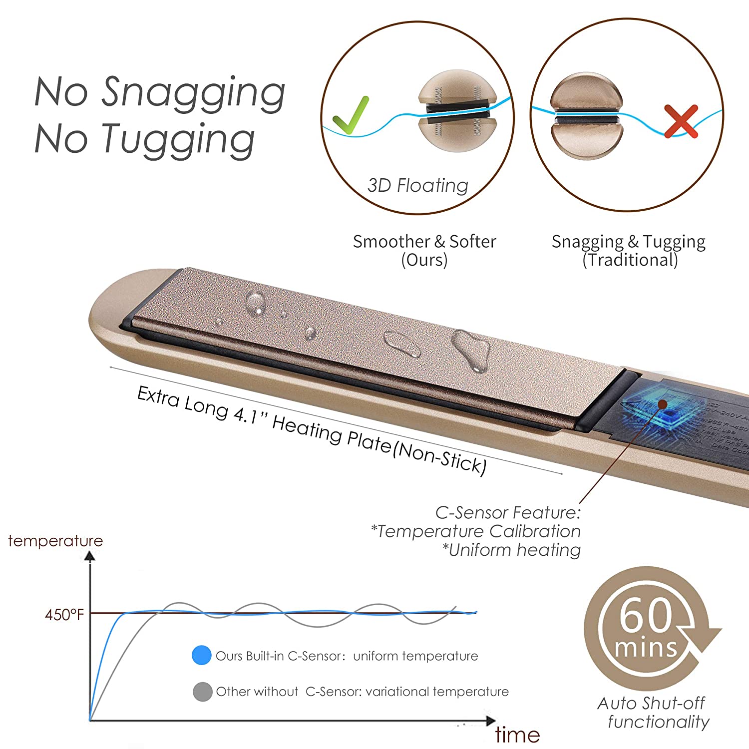 NITION Professional Salon Hair Straightener Argan Oil Tourmaline Ceramic Titanium Straightening Flat Iron for Healthy Styling.LCD 265°F-450°F.2-in-1 Curling Iron for All Hair Type.Gold.1 inch Plate
