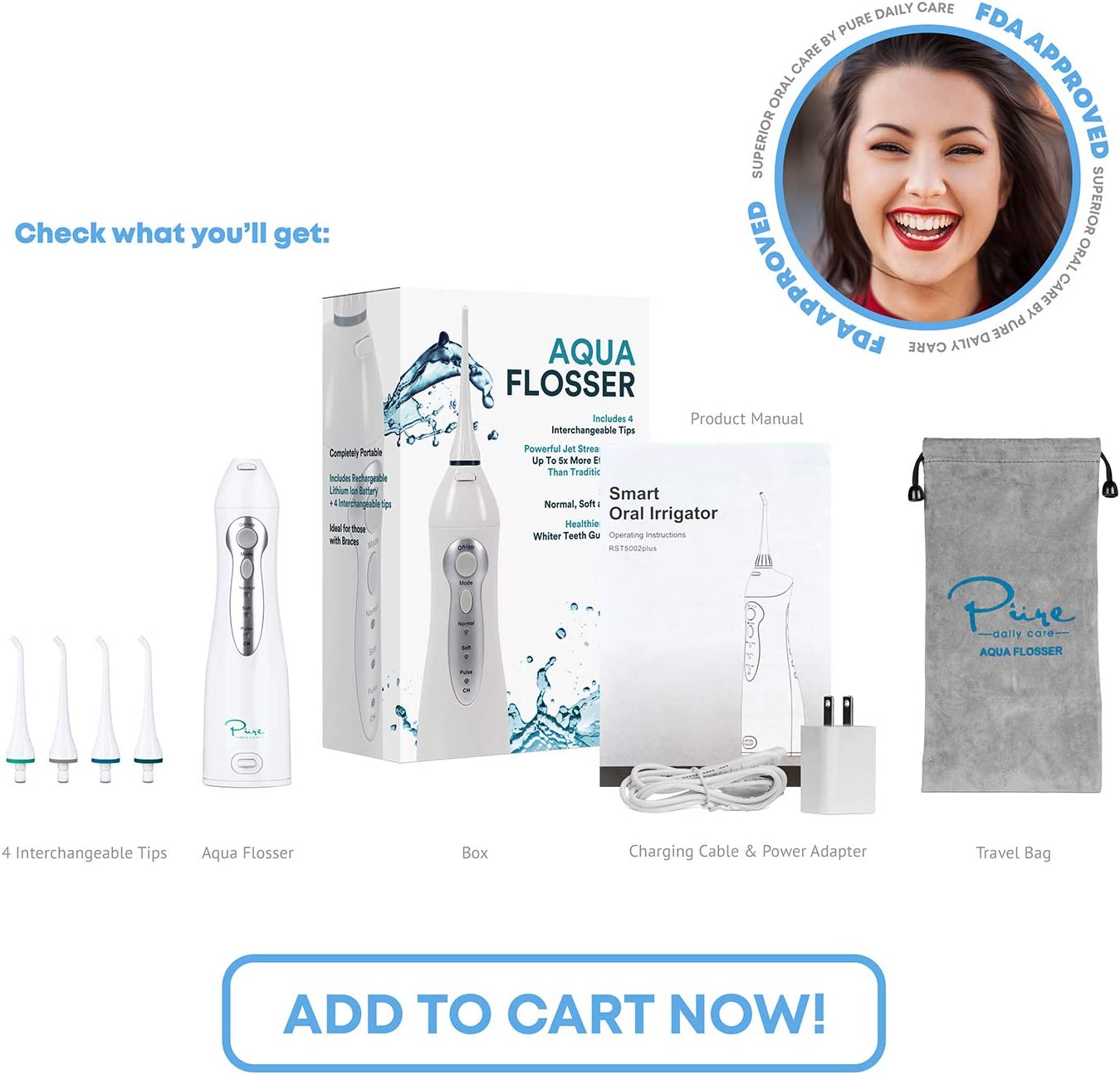 Aquasonic Aqua Flosser - Professional Rechargeable Water Flosser with 4 Tips - Oral Irrigator w/ 3 Modes - Portable & Cordless Flosser - Kids and Braces - Dentist Recommended