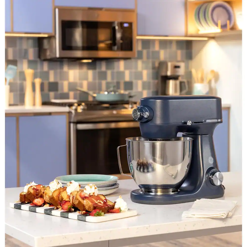GE 5.3 Qt. 7-Speed Sapphire Blue Stand Mixer with Coated Flat Beater. Coated Dough Hook. Wire Whisk. and Pouring Shield