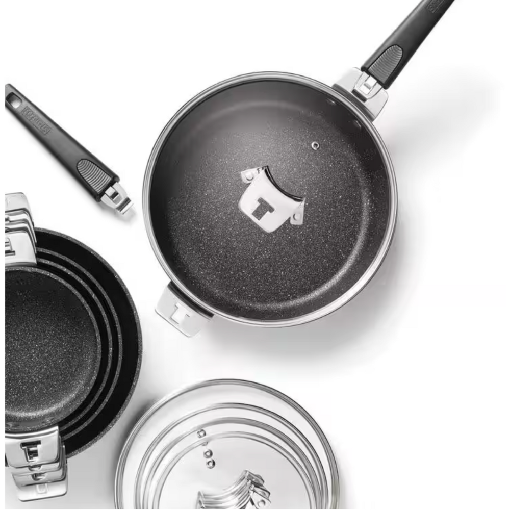 The Rock By Starfrit 12-Piece Aluminum Space-Saving Cookware Set with T-Lock Detachable Handles