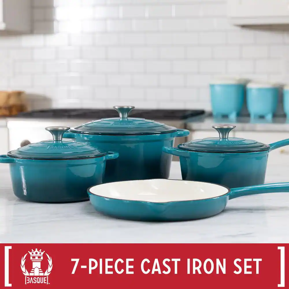 Basque 7-Piece Enameled Cast Iron Nonstick Cookware Set in Biscay Blue