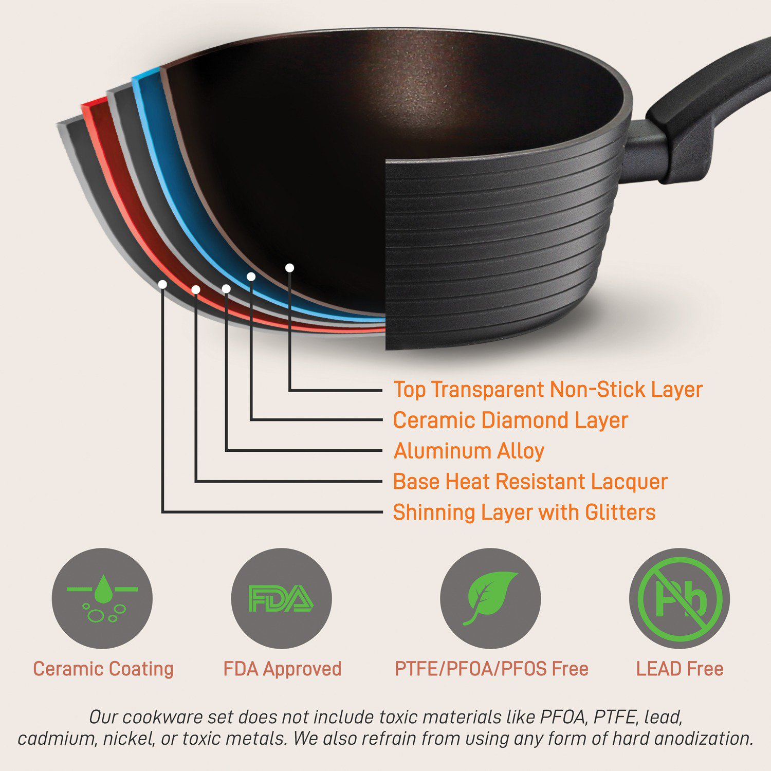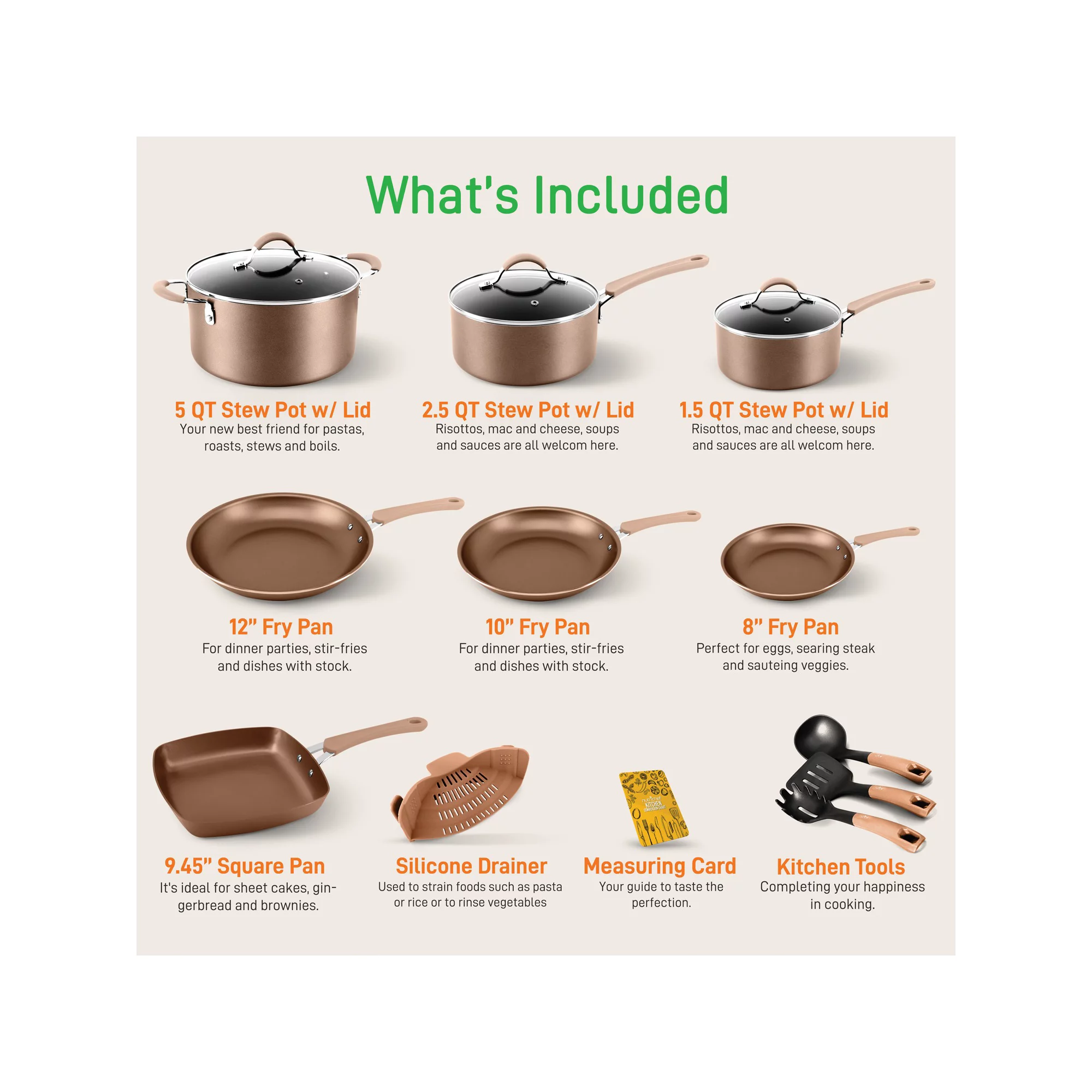NutriChef NCCW14S 14-Piece Kitchenware Pots and Pans Set. Brown