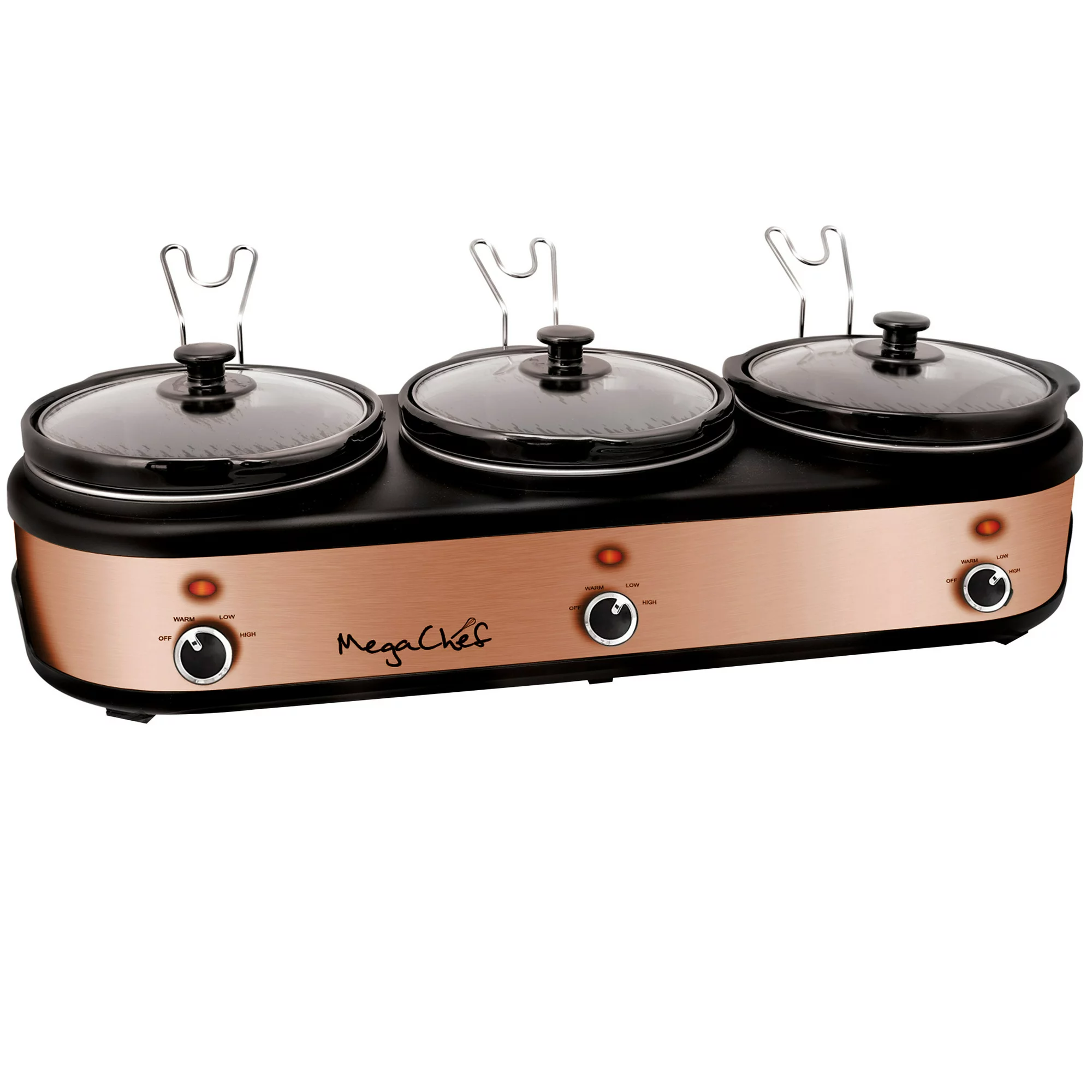 MegaChef Triple 2.5 Quart Slow Cooker and Buffet Server with 3 Ceramic Cooking Pots and Removable Lid Rests. Brushed Copper