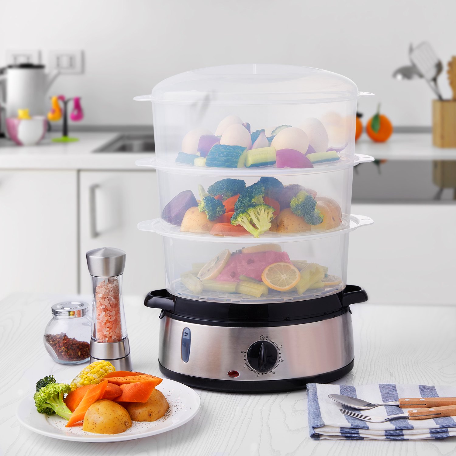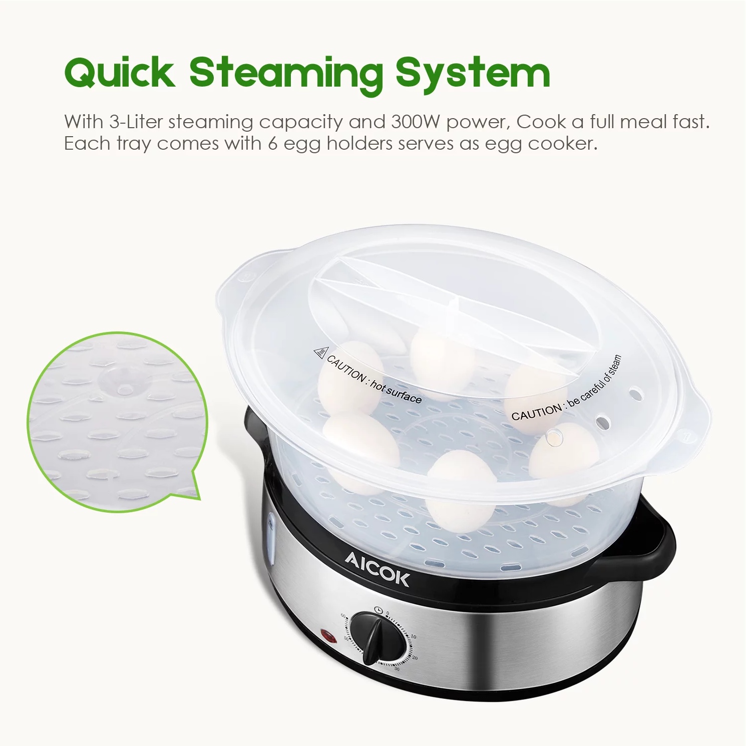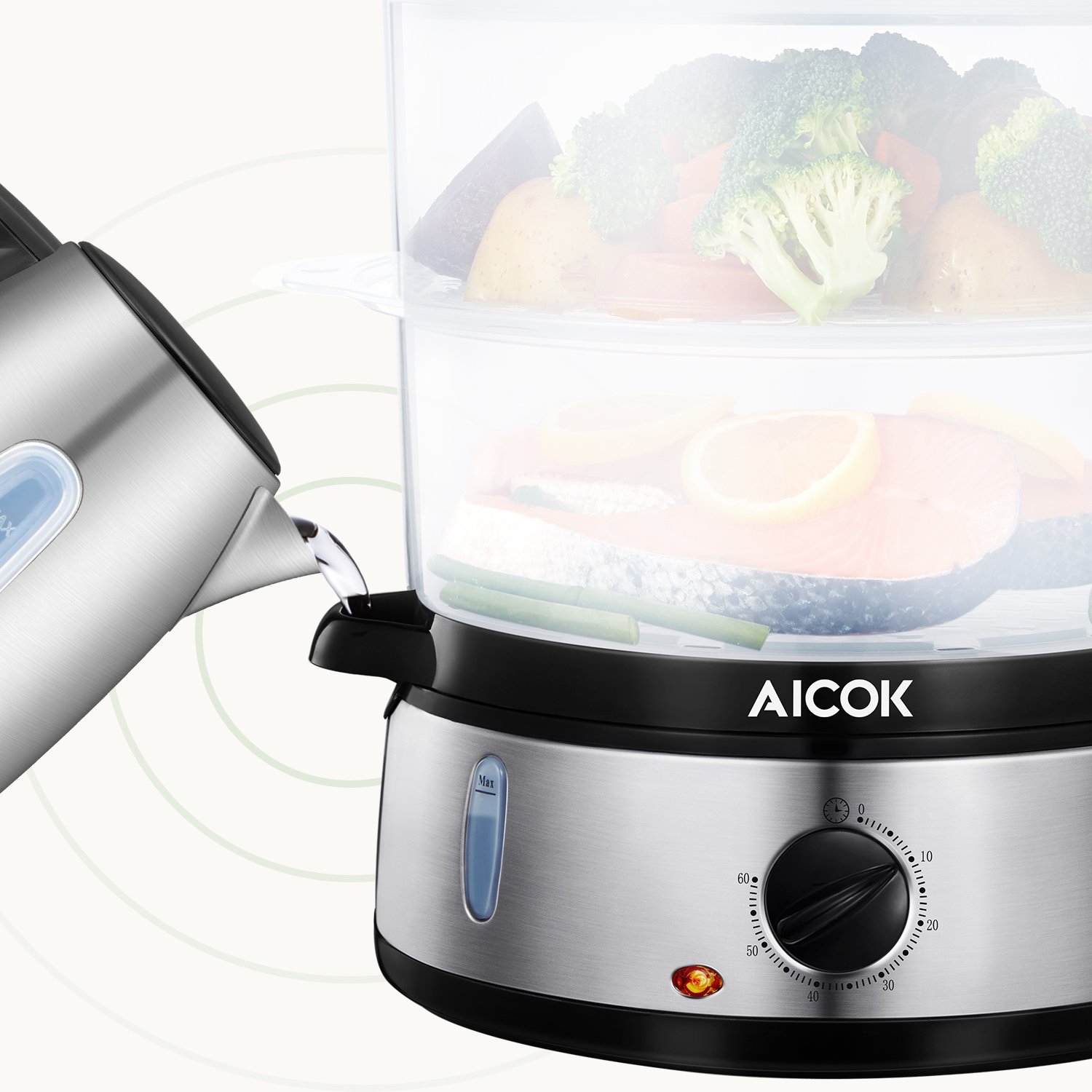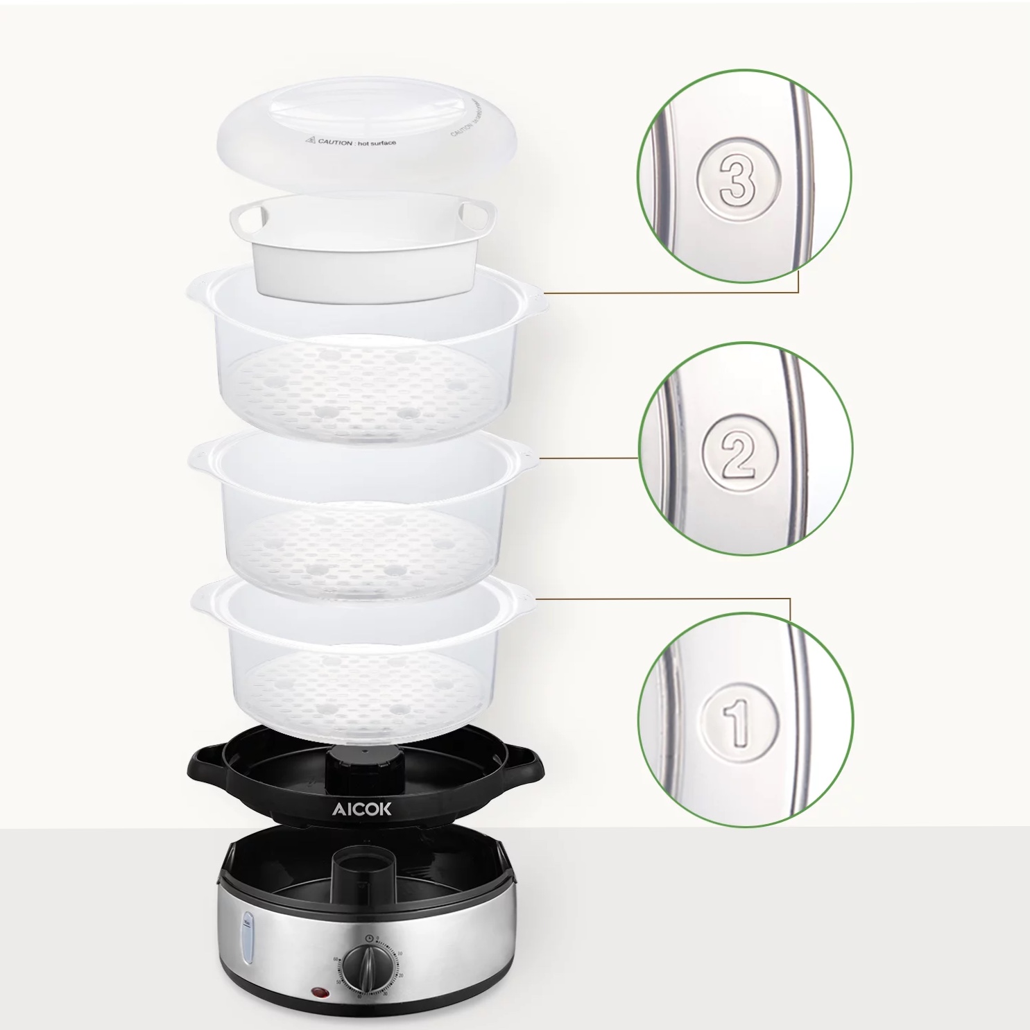 Aicok 3-Tier 9.5 Qt Electric Cooking Steamer. 800W Fast Cooking. White