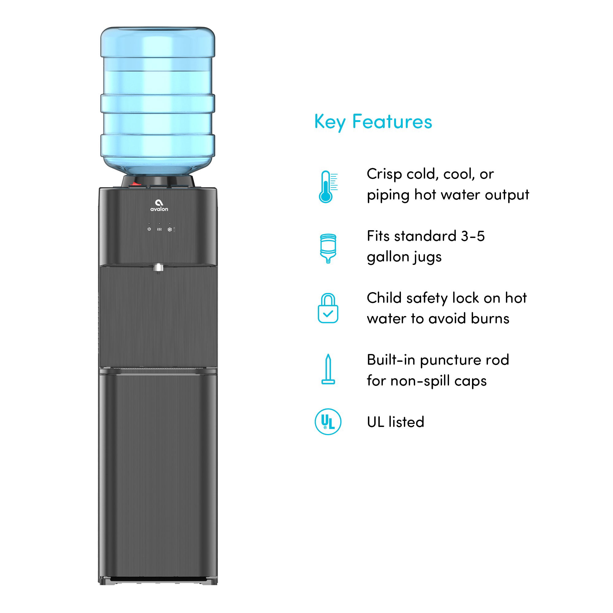 Avalon Top Loading Water Cooler Dispenser - 3 Temperature. Child Safety Lock. Innovative Design. UL Listed- Black Stainless Steel