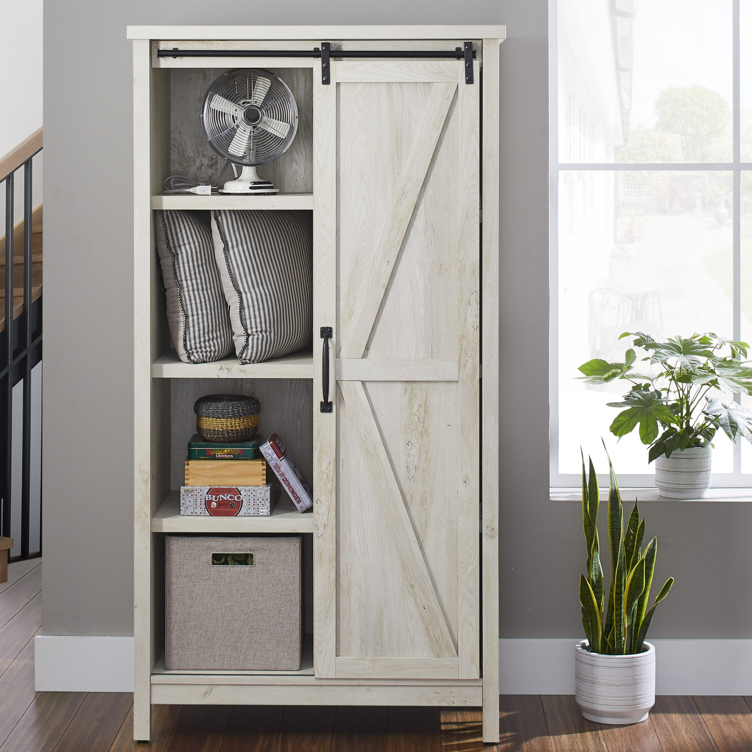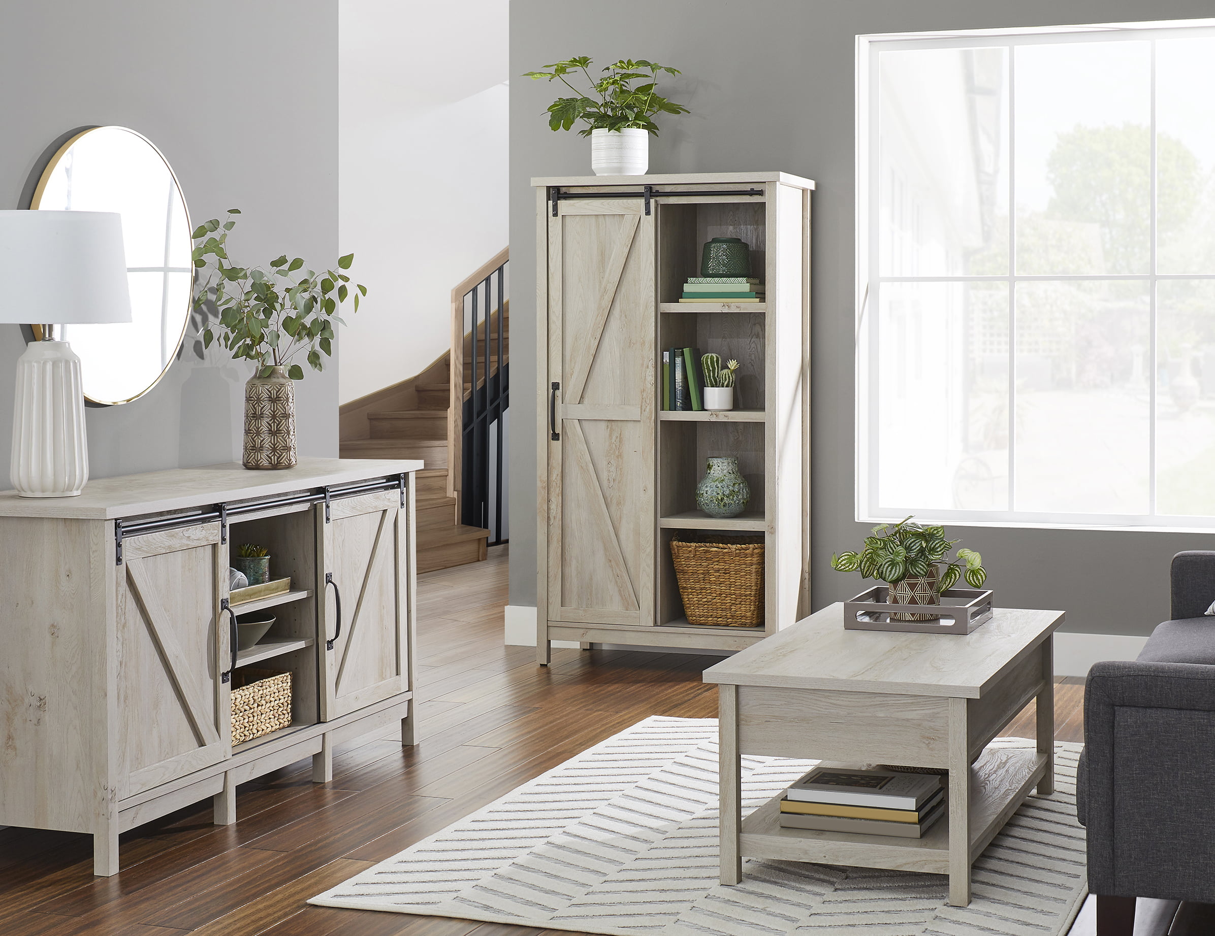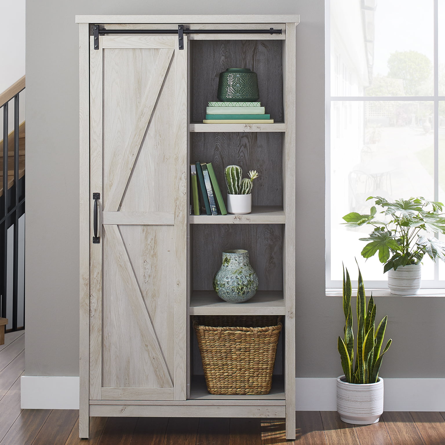 Better Homes & Gardens 66″ Modern Farmhouse Bookcase Storage Cabinet. Rustic White Finish