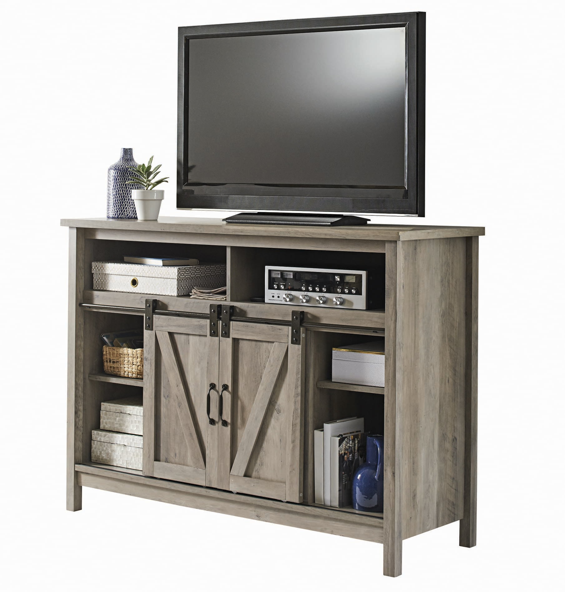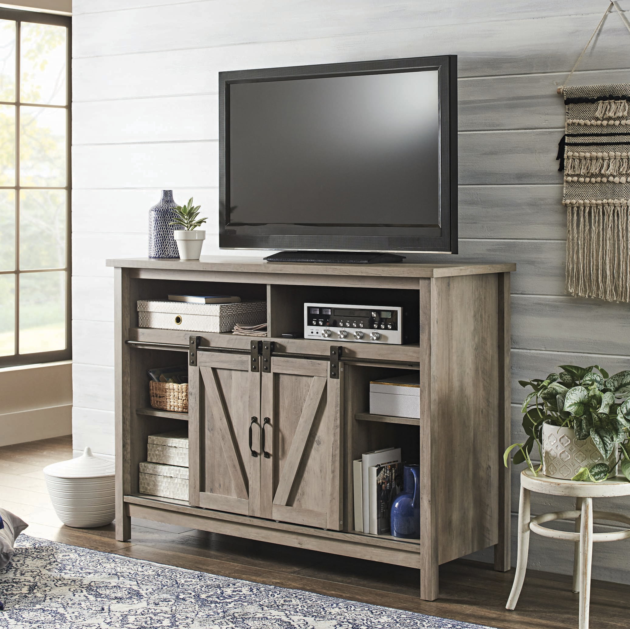 Better Homes & Gardens Modern Farmhouse Fireplace TV Stand for TVs up to 50″. Rustic Gray Finish