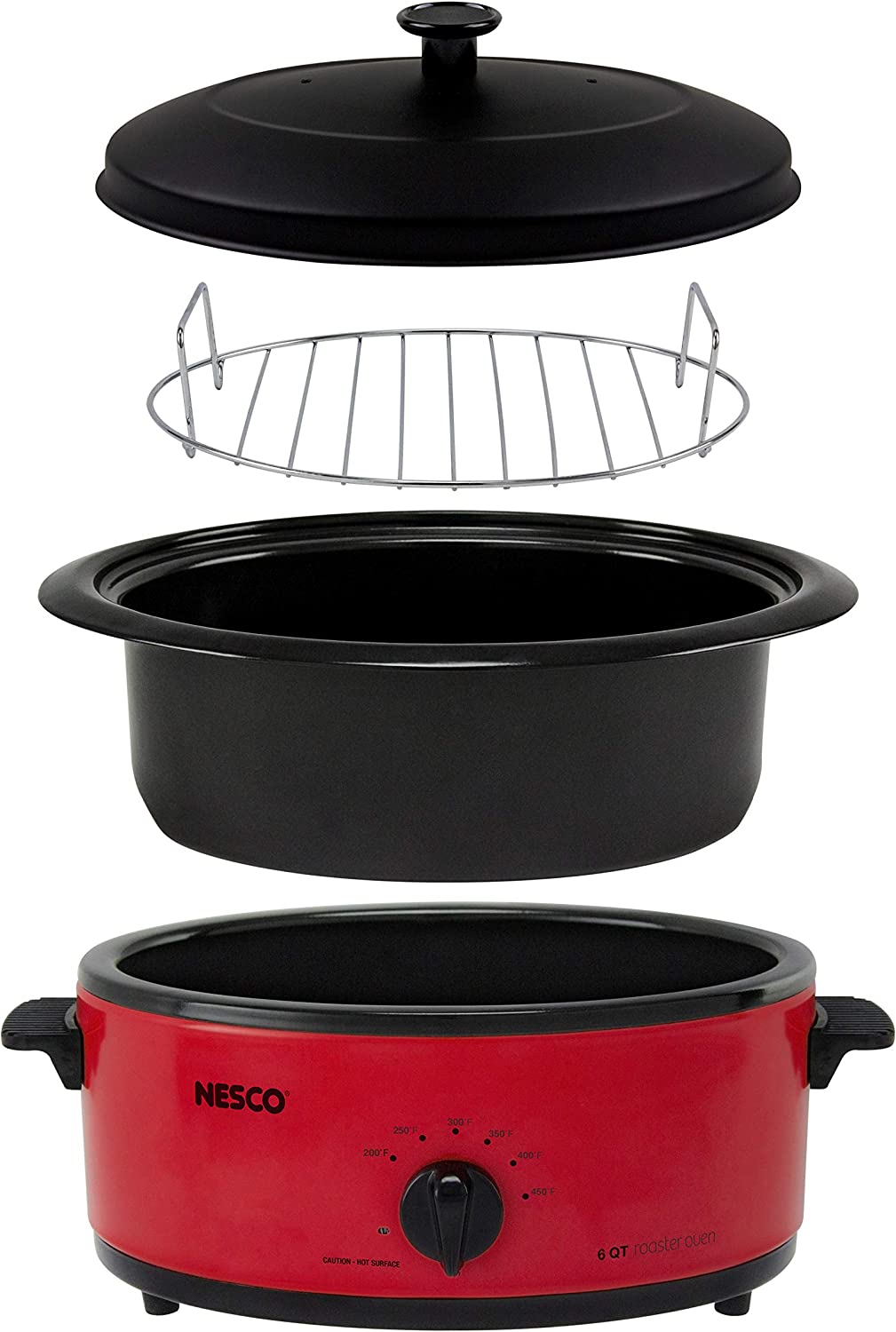 NESCO 4816-12 Roaster Oven with Porcelain Cookwell. Red. 6 quart. 750 watts