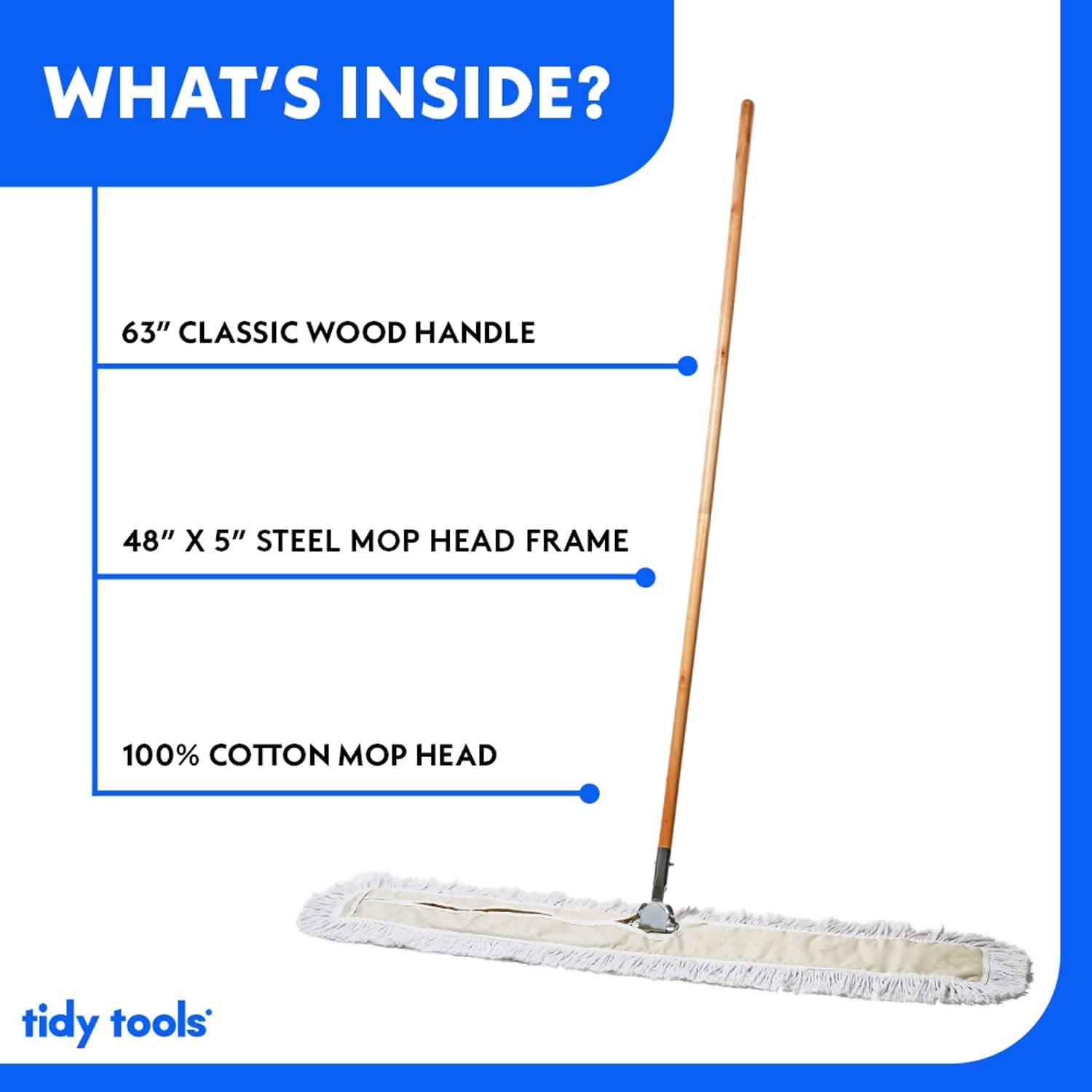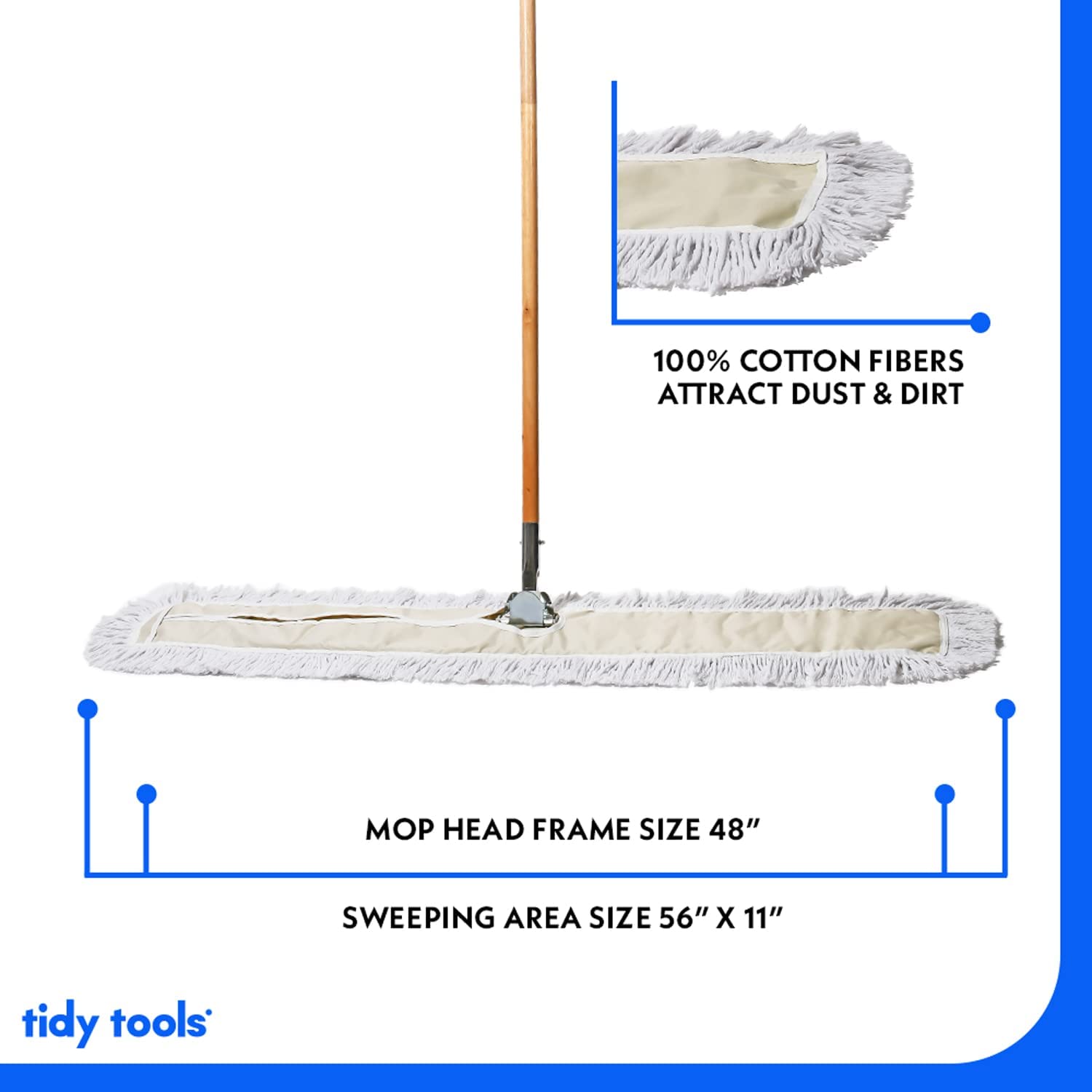 Tidy Tools Commercial Dust Mop & Floor Sweeper – 48 x 5 in. Cotton Reusable Mop Head. Wooden Broom Handle & Metal Frame – Industrial Dust Mops for Floor Cleaning & Janitorial Supplies