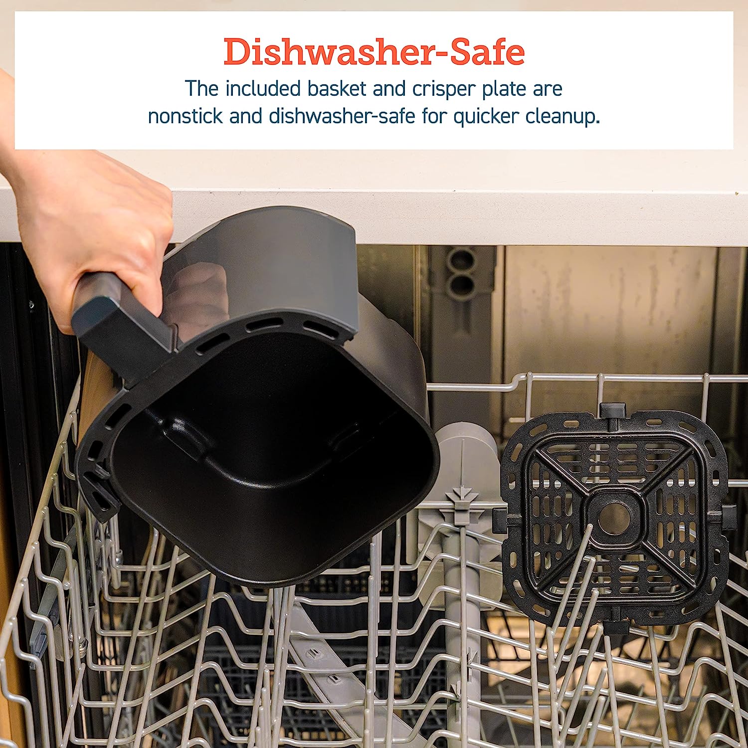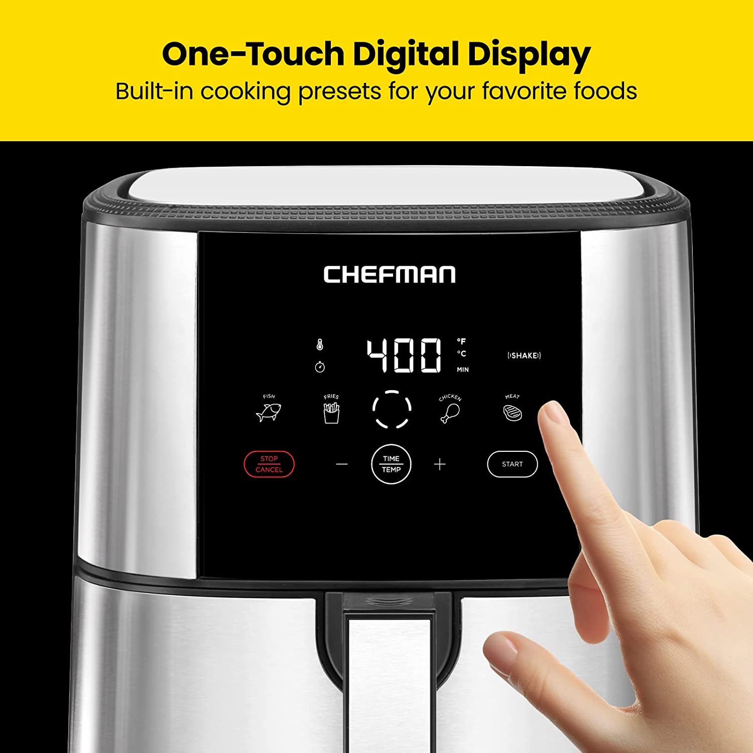 Chefman TurboFry Touch Air Fryer. Large 5-Quart Family Size. One Touch Digital Control Presets. French Fries. Chicken. Meat. Fish. Nonstick Dishwasher-Safe Parts. Automatic Shutoff. Stainless Steel