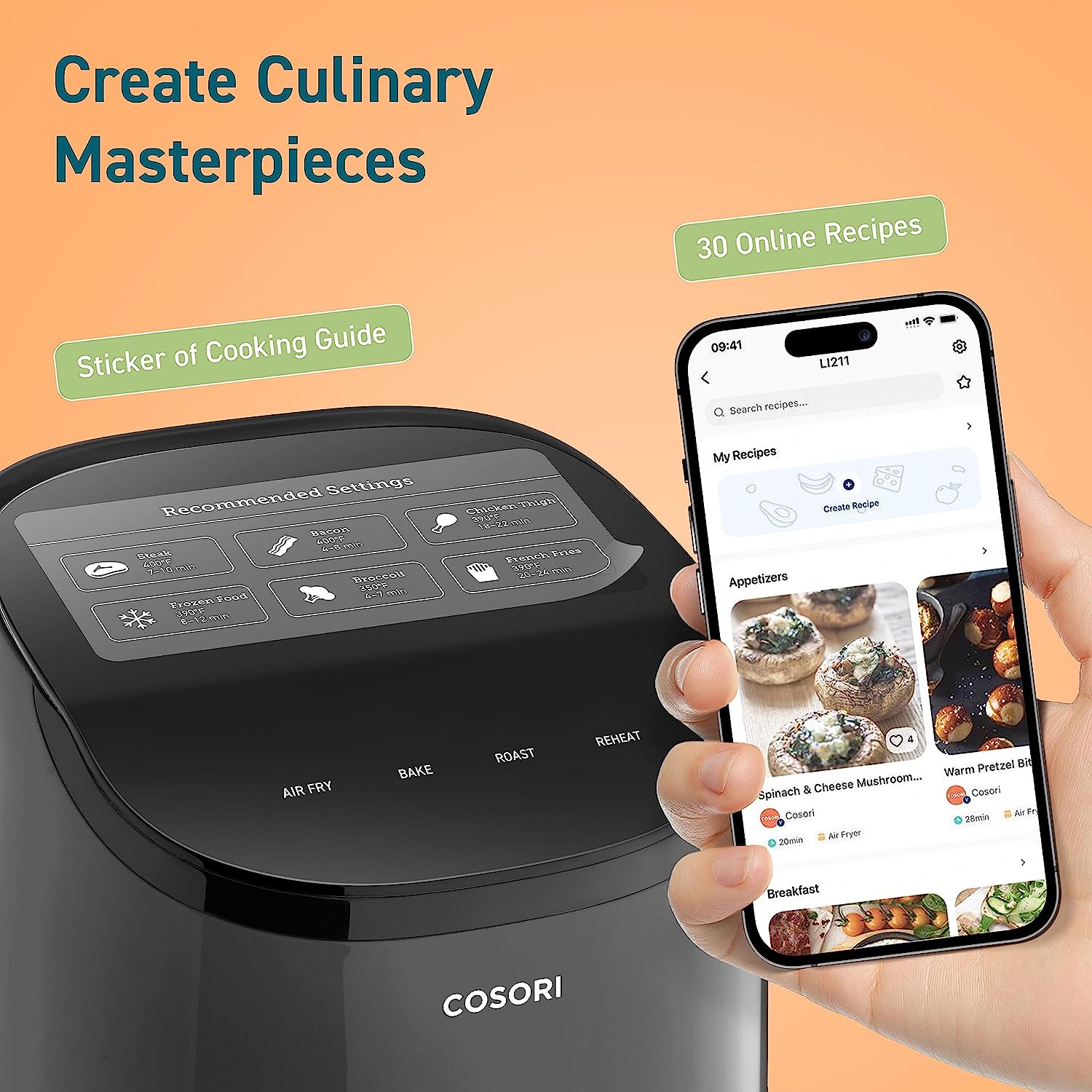 COSORI Small Air Fryer Oven 2.1 Qt. 4-in-1 Mini Airfryer. Bake. Roast. Reheat. Space-saving & Low-noise. Nonstick and Dishwasher Safe Basket. 30 In-App Recipes. Sticker with 6 Reference Guides. Gray