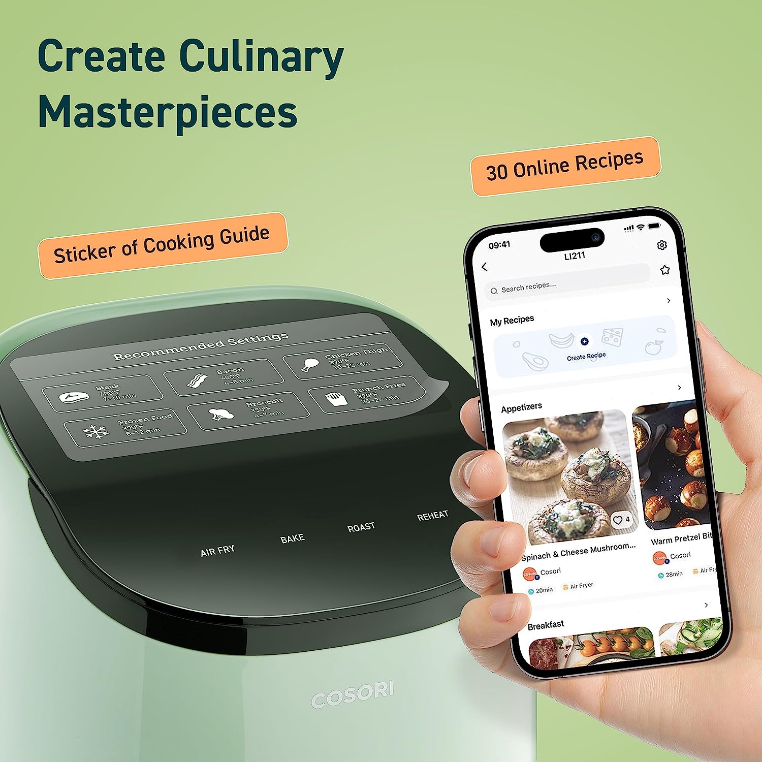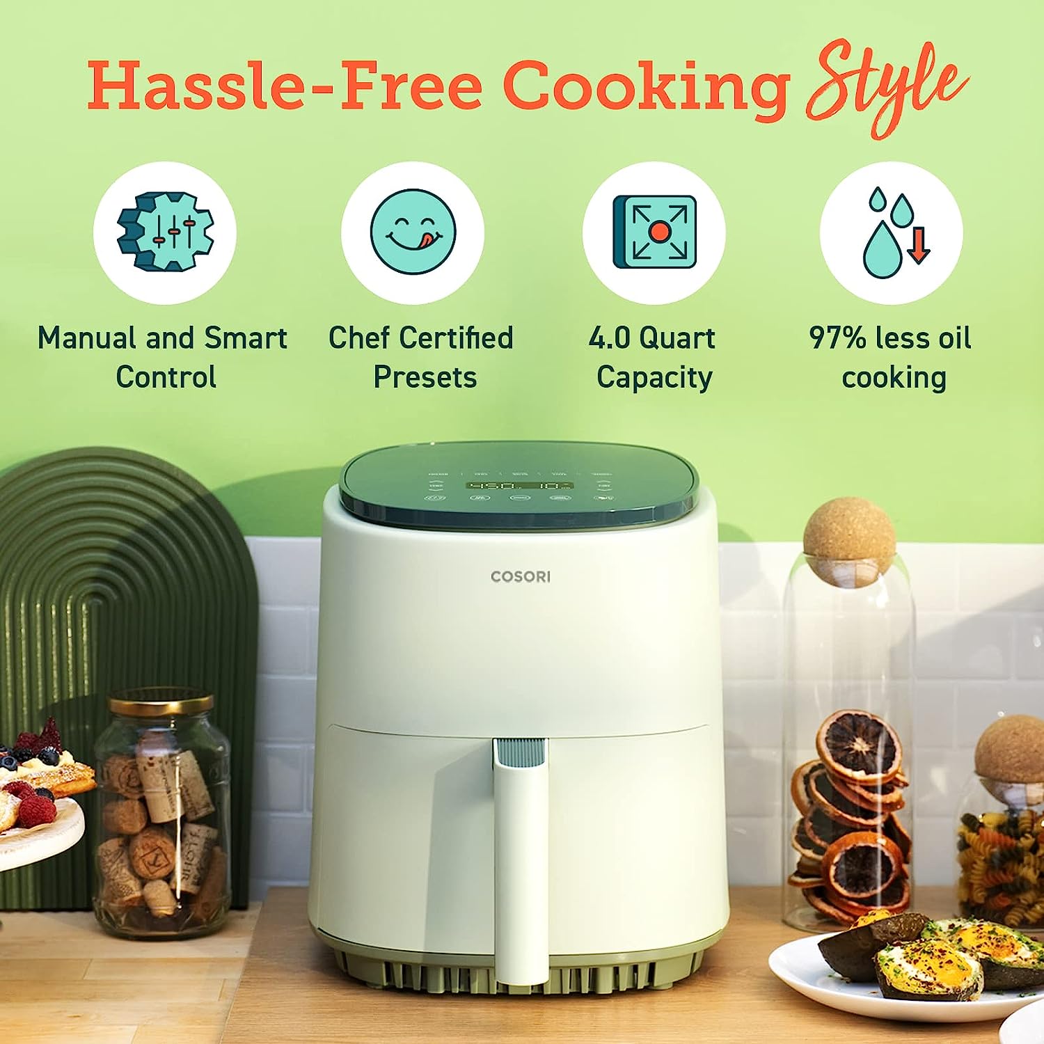 COSORI Air Fryer 4 Qt. 7 Cooking Functions Airfryer. 150+ Recipes on Free App. 97% less fat Freidora de Aire. Dishwasher-safe. Designed for 1-3 People. Lite 4.0-Quart Smart Air Fryer. Sage Green