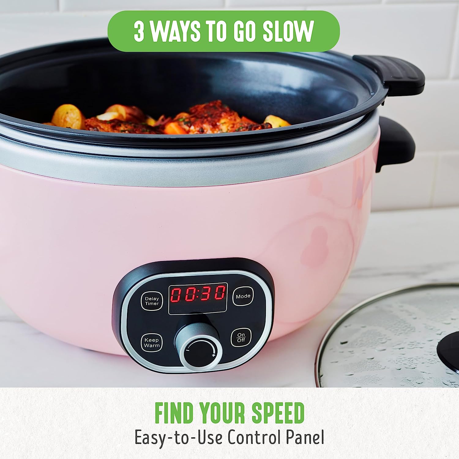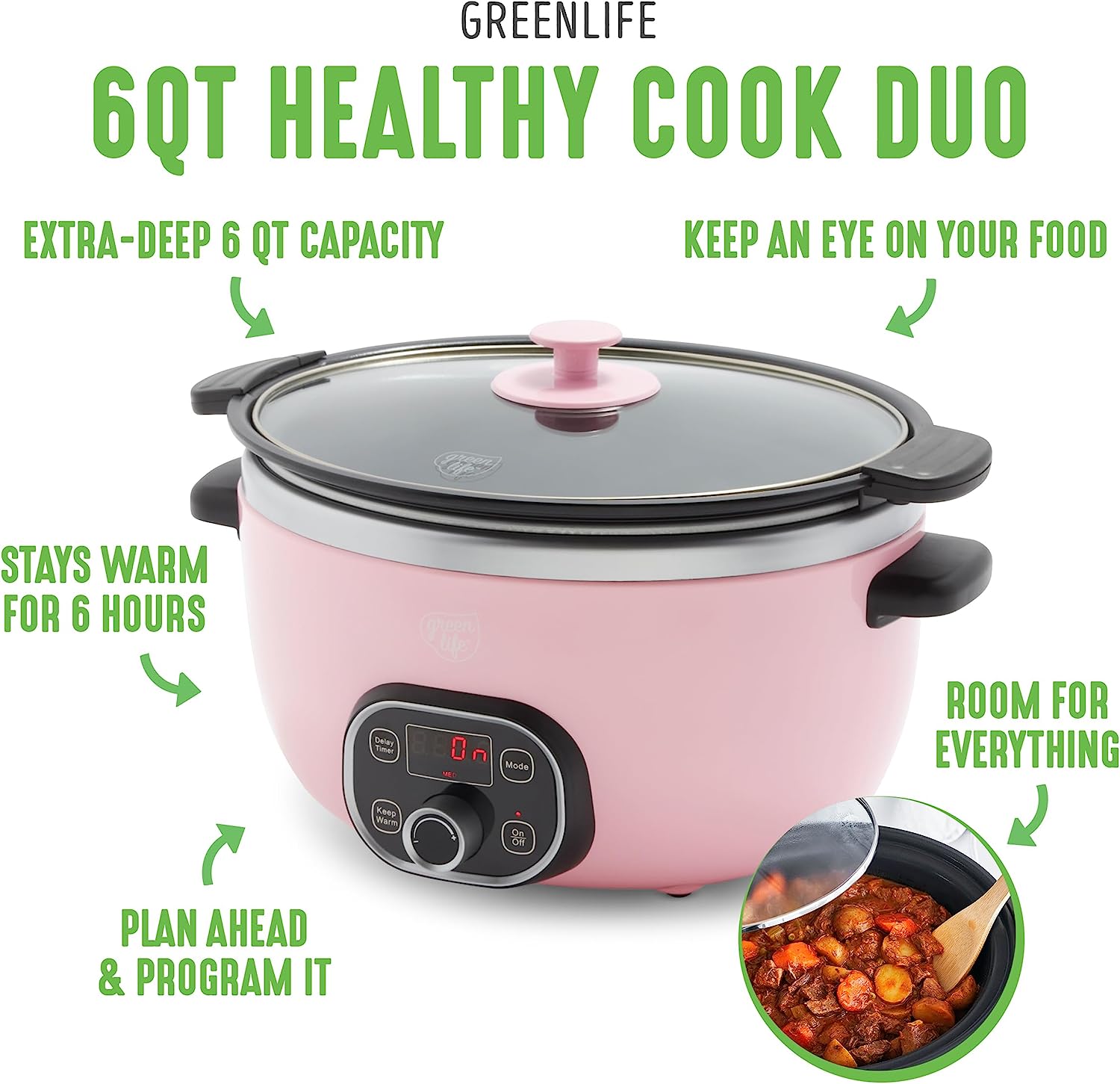 GreenLife Cook Duo Healthy Ceramic Nonstick Programmable 6 Quart Family-Sized Slow Cooker. PFAS-Free. Removable Lid and Pot. Digital Timer. Dishwasher Safe Parts. Pink