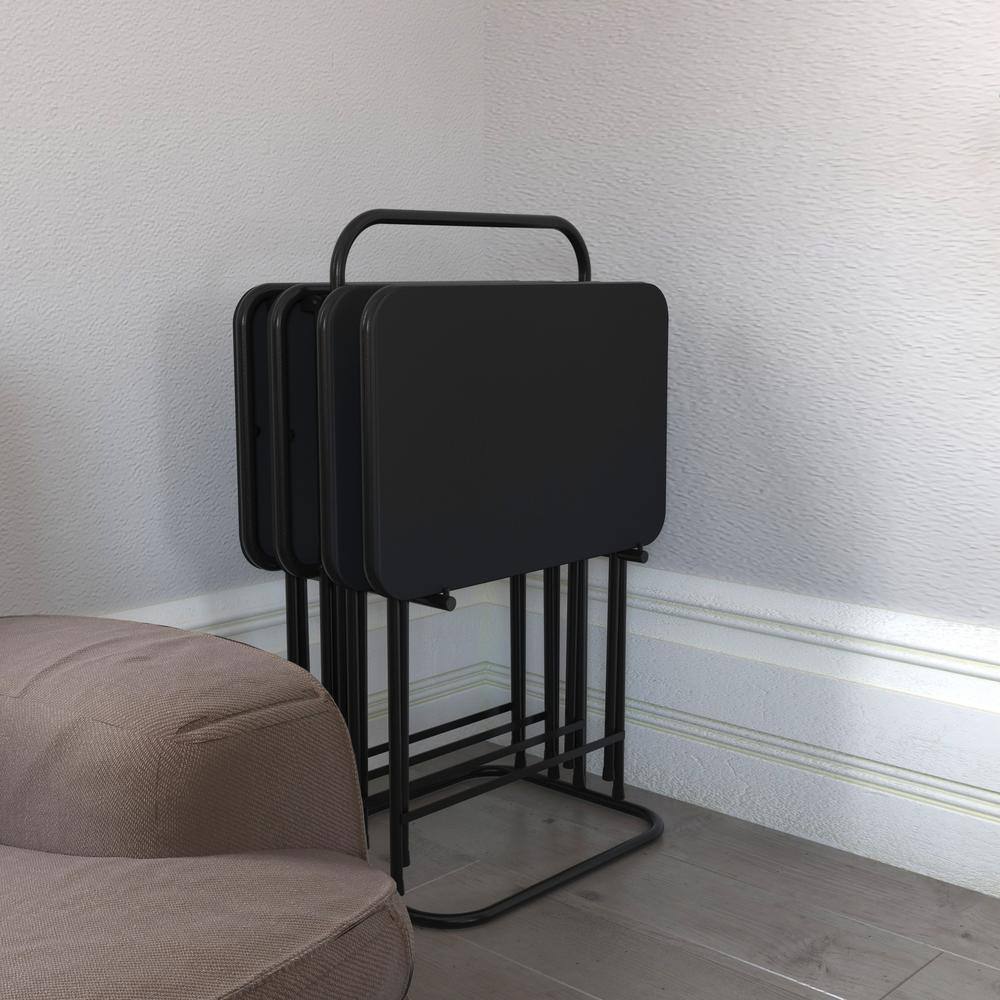 Cosco Folding Plastic Rectangular TV Tray Set in Black with Storage Rack