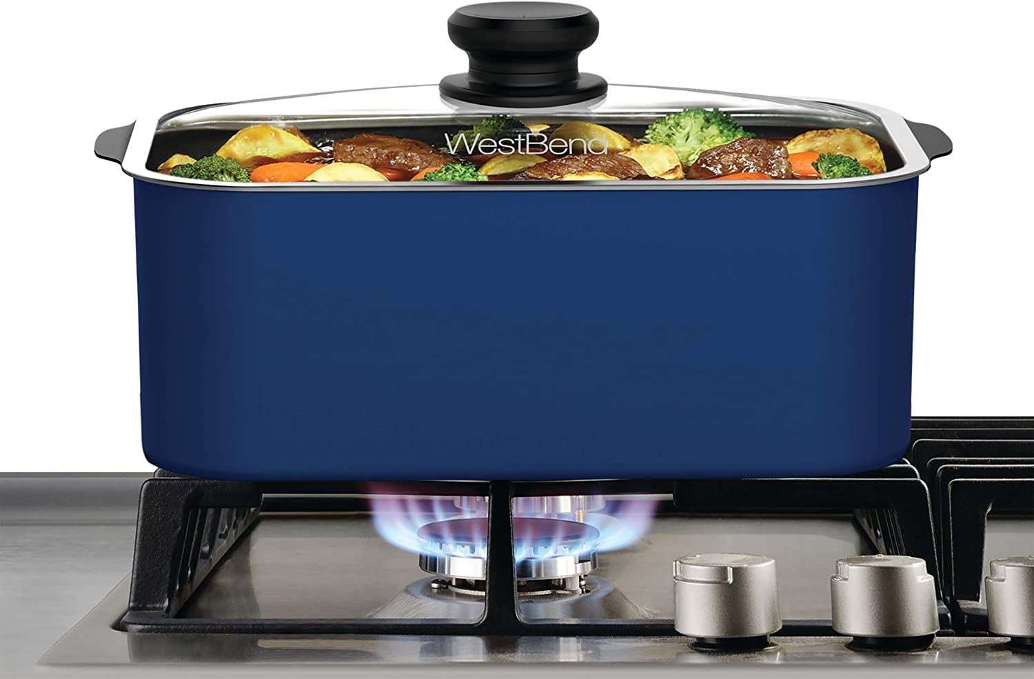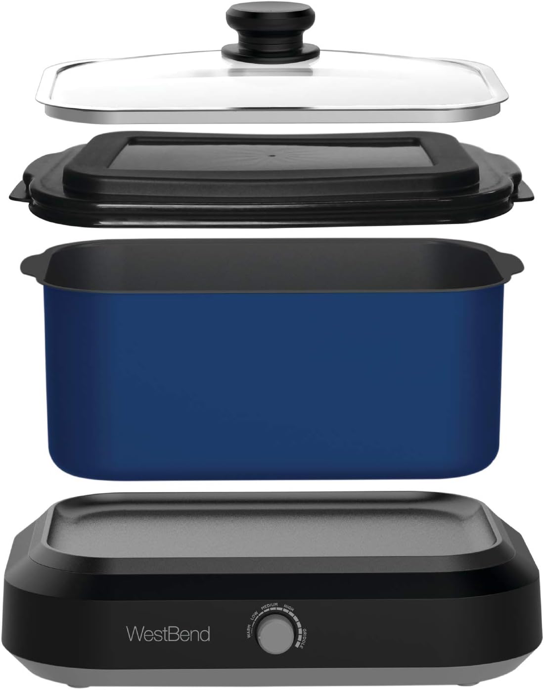 West Bend 87906B Slow Cooker. Large-Capacity Non-Stick Crockpot with Variable Temperature Control. Travel Lid and Thermal Carrying Case. 6 Qt. Blue
