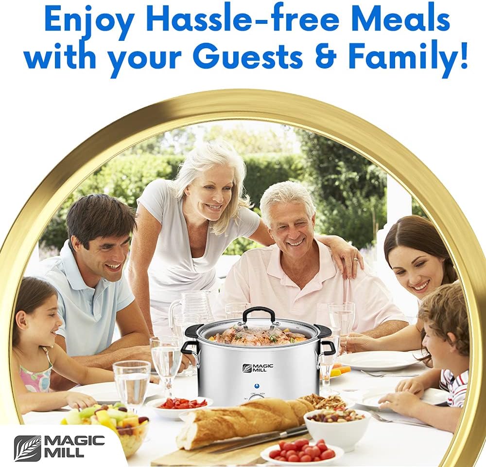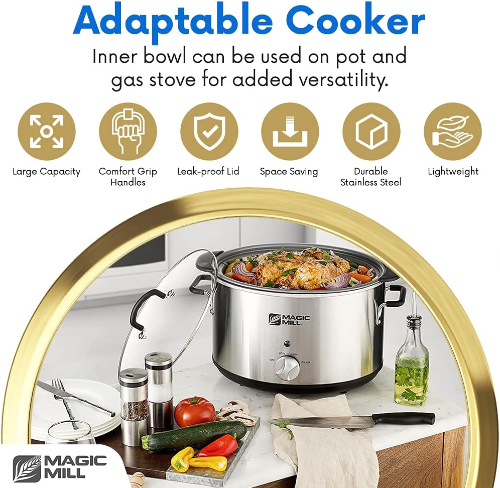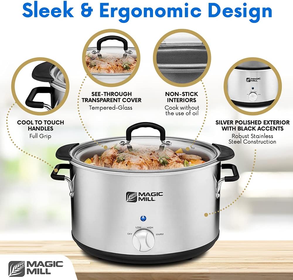 Magic Mill Extra Large 10 Quart Slow Cooker With Metal Searing Pot & Transparent Tempered Glass Lid Multipurpose Lightweight Slow Cookers. Pot is Safe to Put the On the Flame. Dishwasher Safe