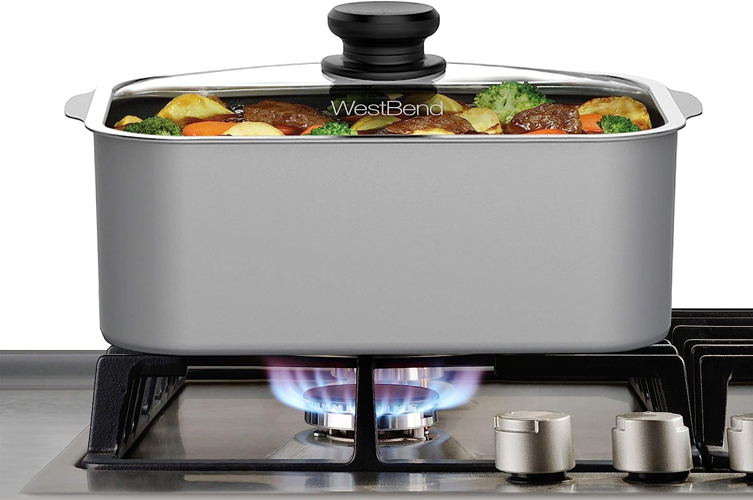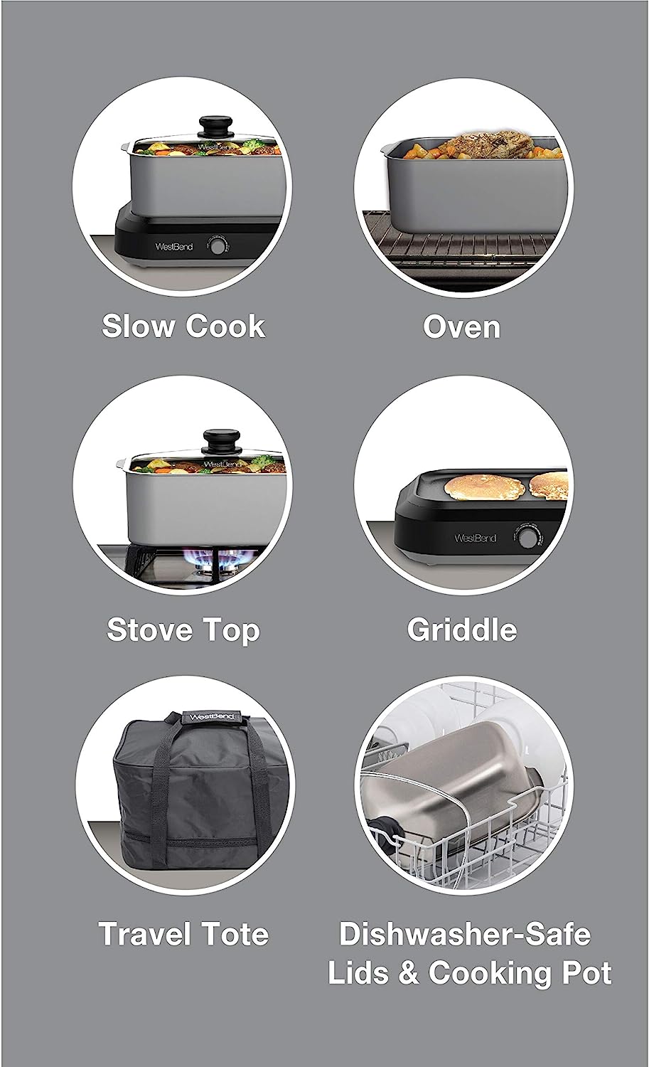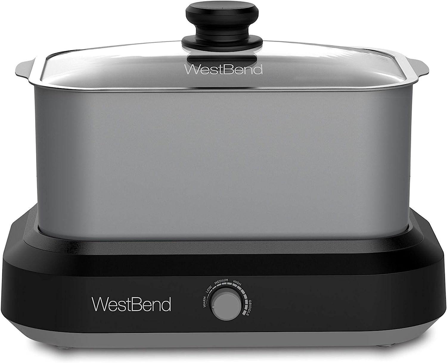 West Bend 87906 Slow Cooker. Large-Capacity Non-Stick Crockpot with Variable Temperature Control. Travel Lid and Thermal Carrying Case. 6 Qt. Silver
