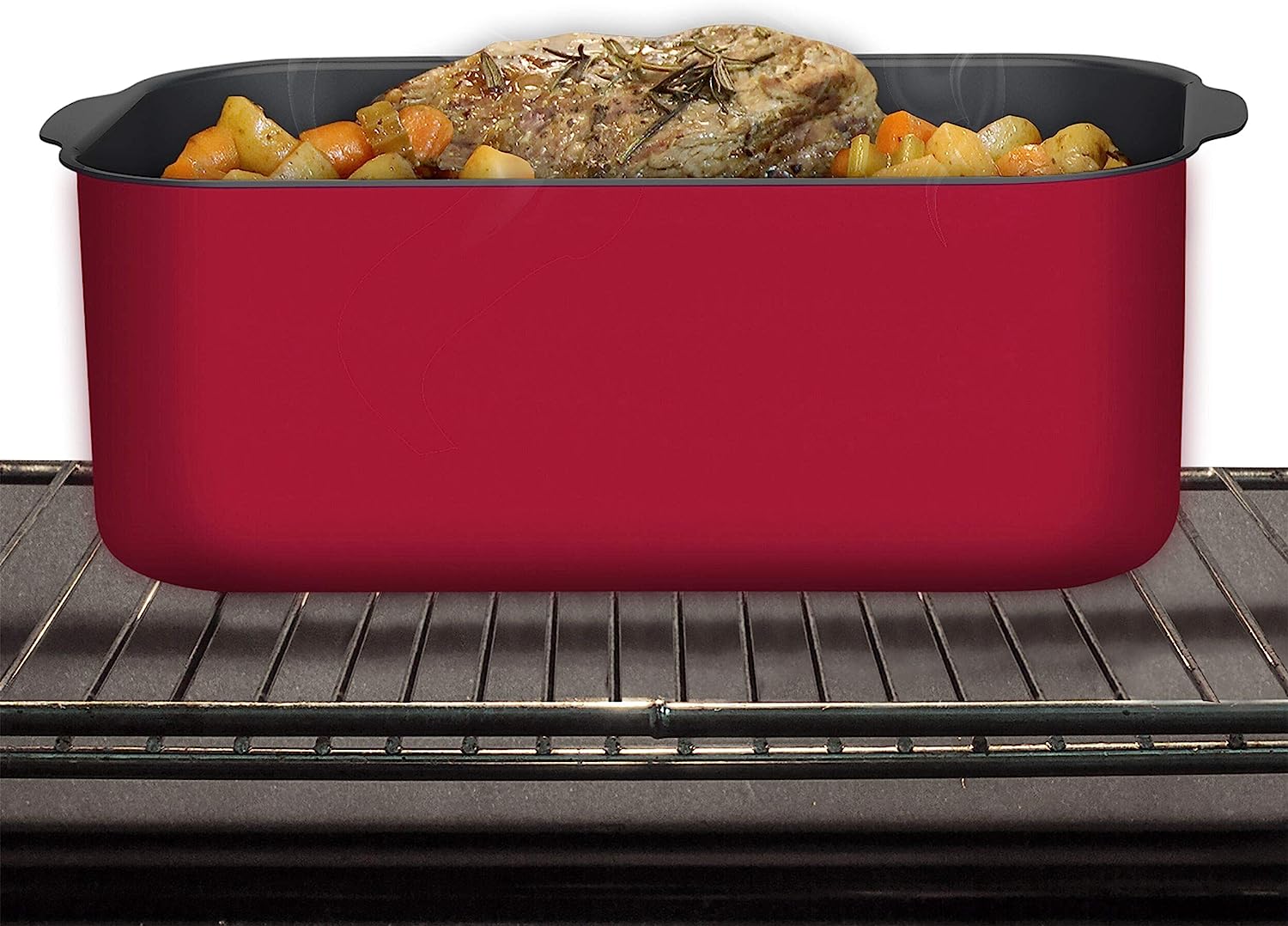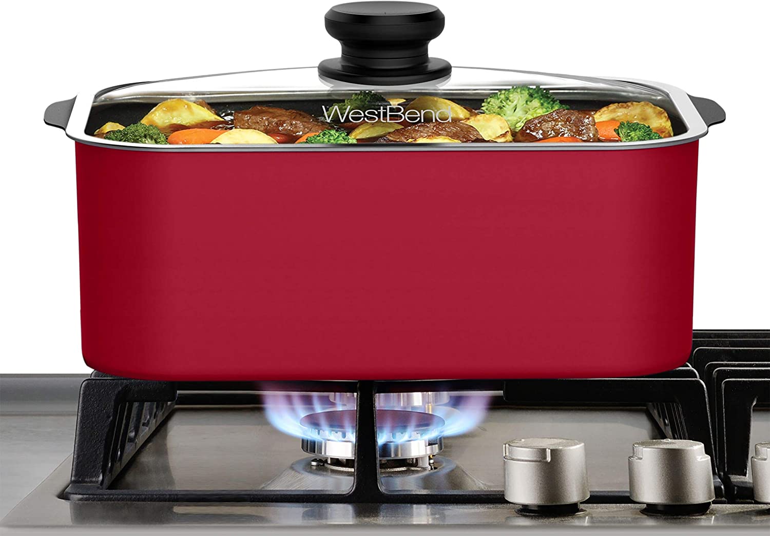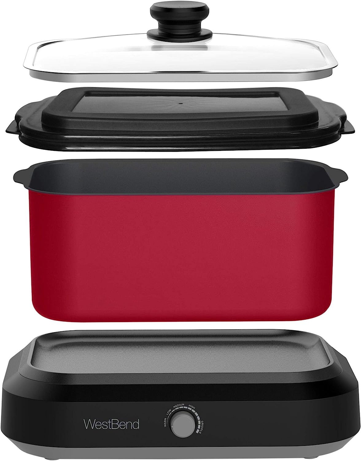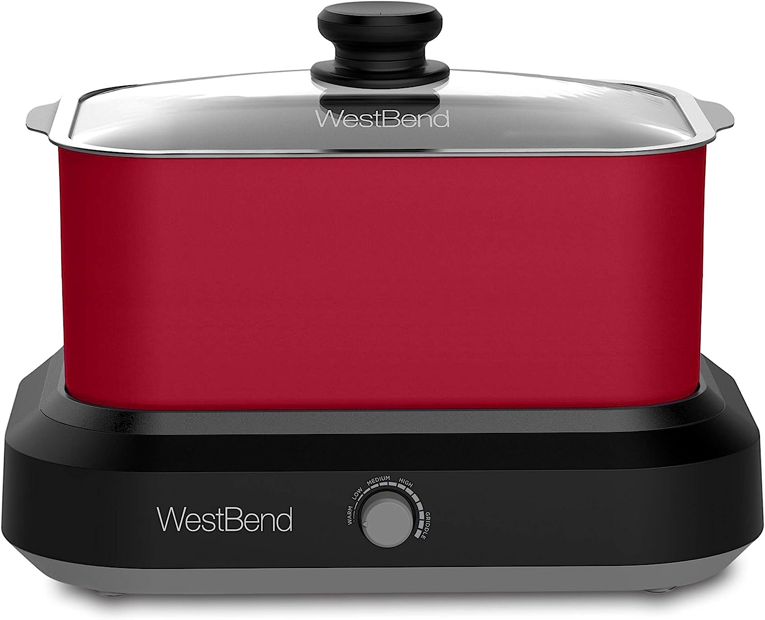 West Bend 87906R Slow Cooker. Large-Capacity Non-Stick Crockpot with Variable Temperature Control. Travel Lid and Thermal Carrying Case. 6 Qt. Red
