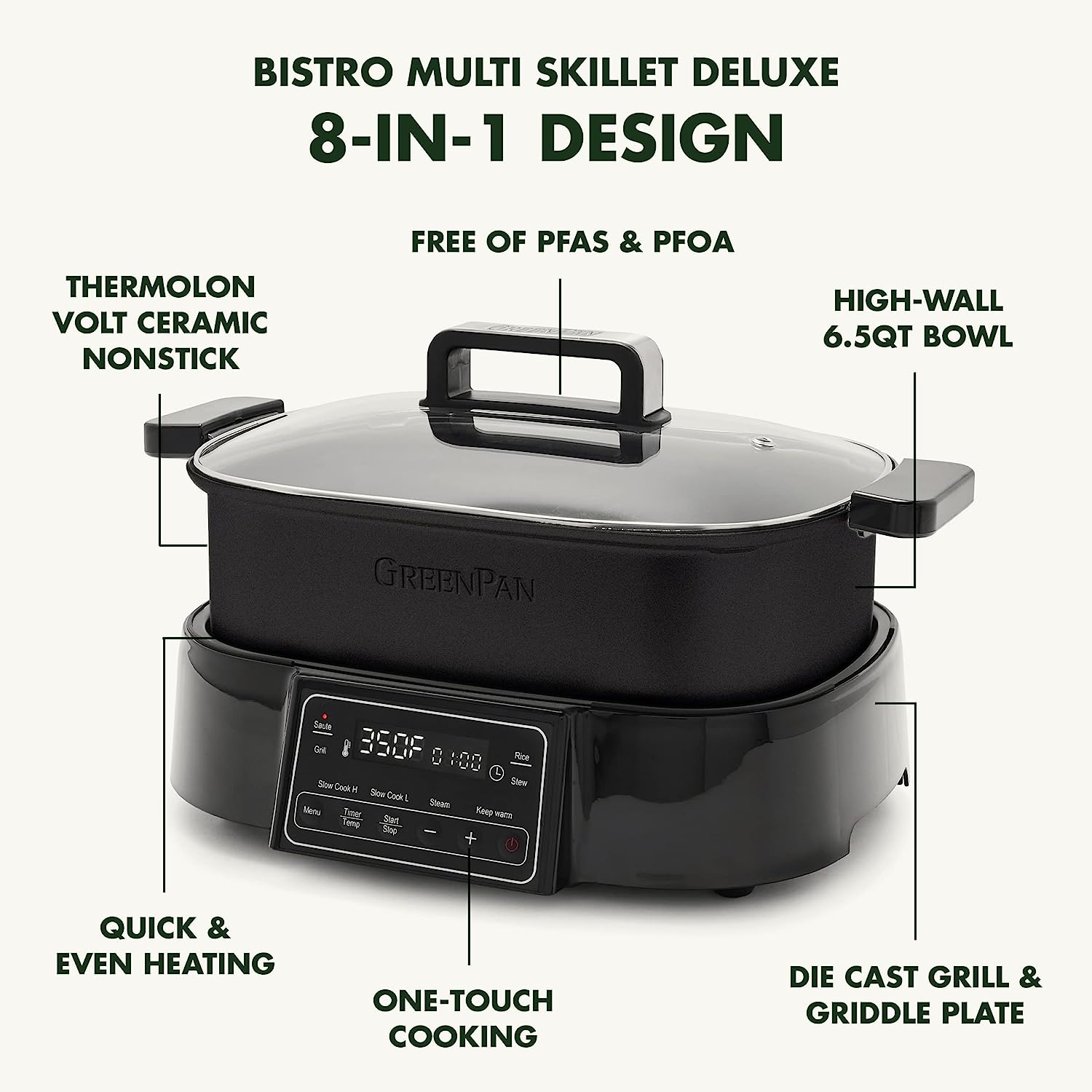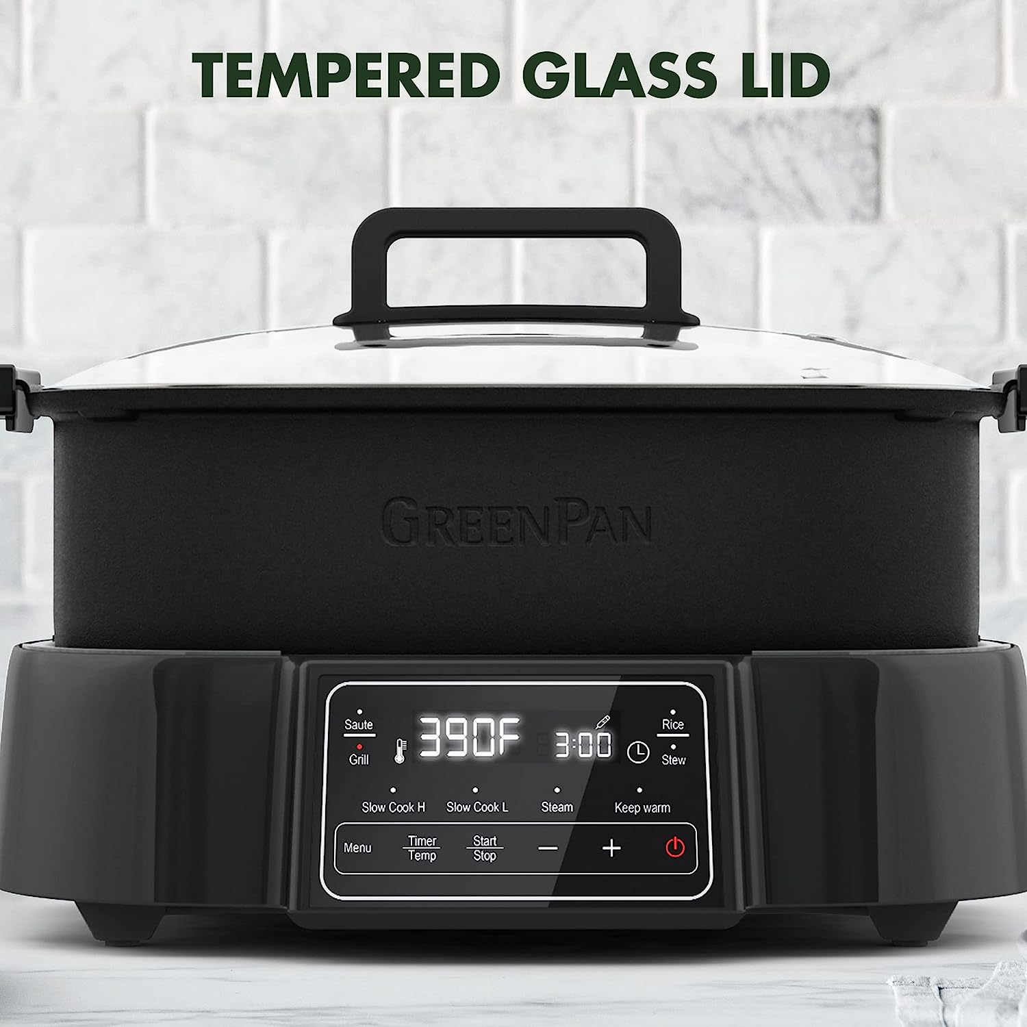 GreenPan 6.5QT Multi-Cooker Skillet Grill & Slow Cooker. 8-in-1 Presets to Saute.Steam. Grill. Stew.Slow Cook. Stir-Fry.Heat. & Cook Rice. Healthy Ceramic Nonstick & Dishwasher Safe Parts. Matte Black