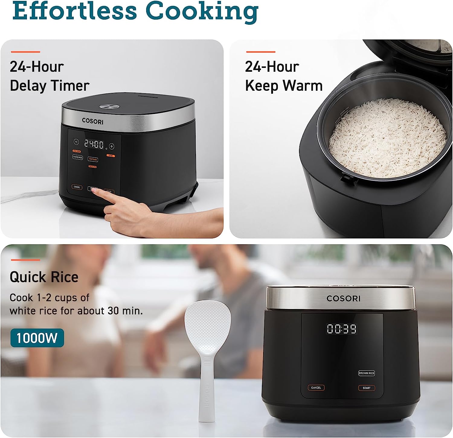 COSORI Rice Cooker Large Maker 10 Cup Uncooked 18 Functions. Japanese Style Fuzzy Logic Micom Technology. Texture Optional. 50 Recipes. Stainless Steel Steamer. Warmer. Timer. Olla Arrocera Electrica.Black