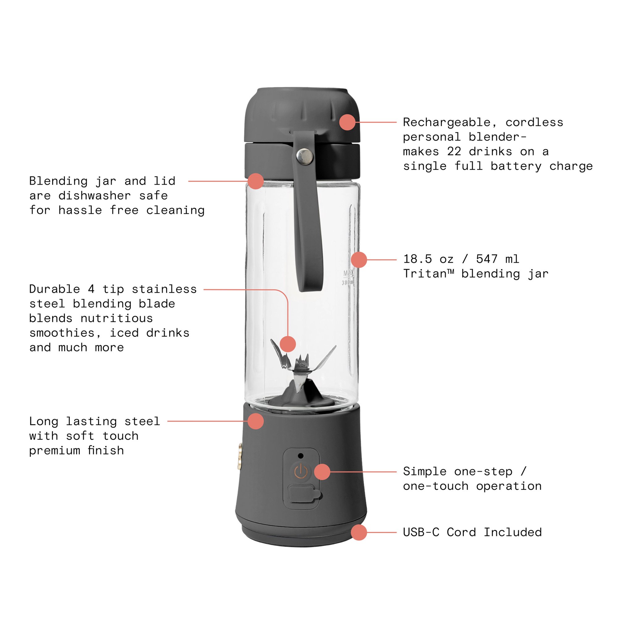 Beautiful Portable Blender. 18.5 Oz. Oyster Grey
