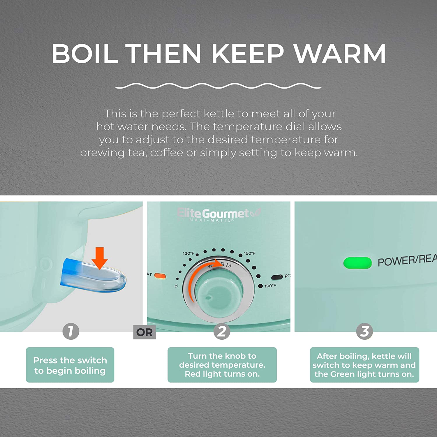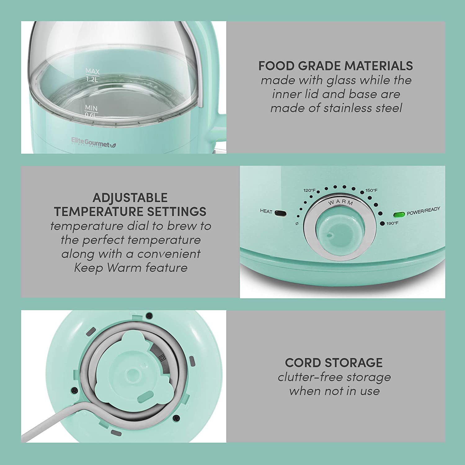 Elite Gourmet 1.2L Adjustable Temperature Electric Glass Kettle. Mint
