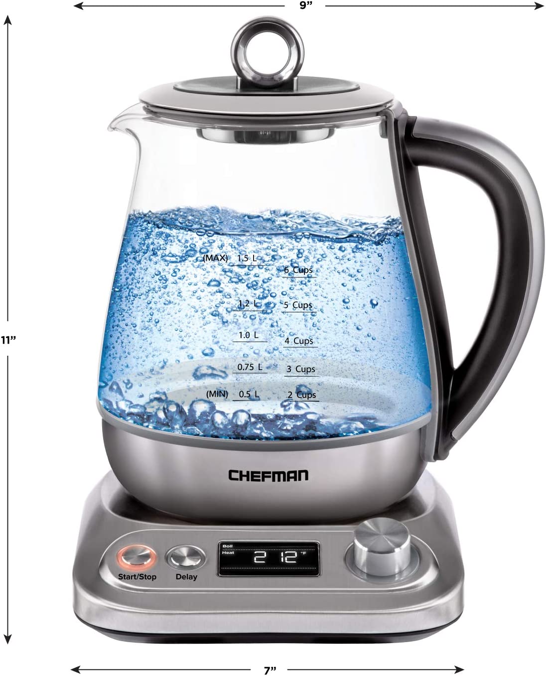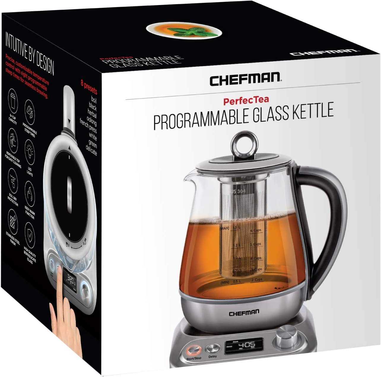 Chefman Digital Electric Glass Kettle. No.1 Kettle Manufacturer. Removable Tea Infuser Included. 8 Presets & Programmable Temperature Control. Auto Shutoff. Water Filter. 6+ Cup Capacity. 1.5 Liter (RJ11-15-SSTC)