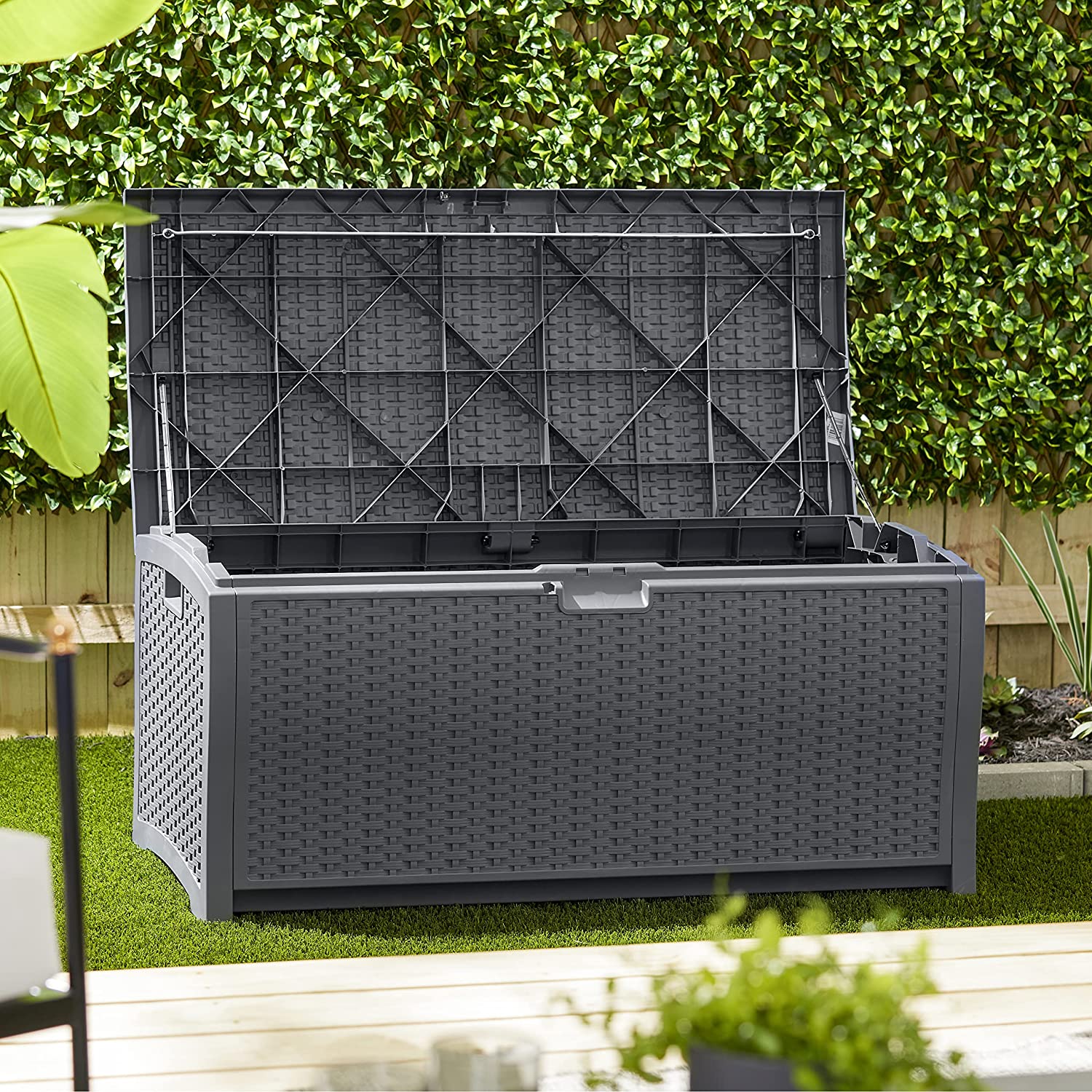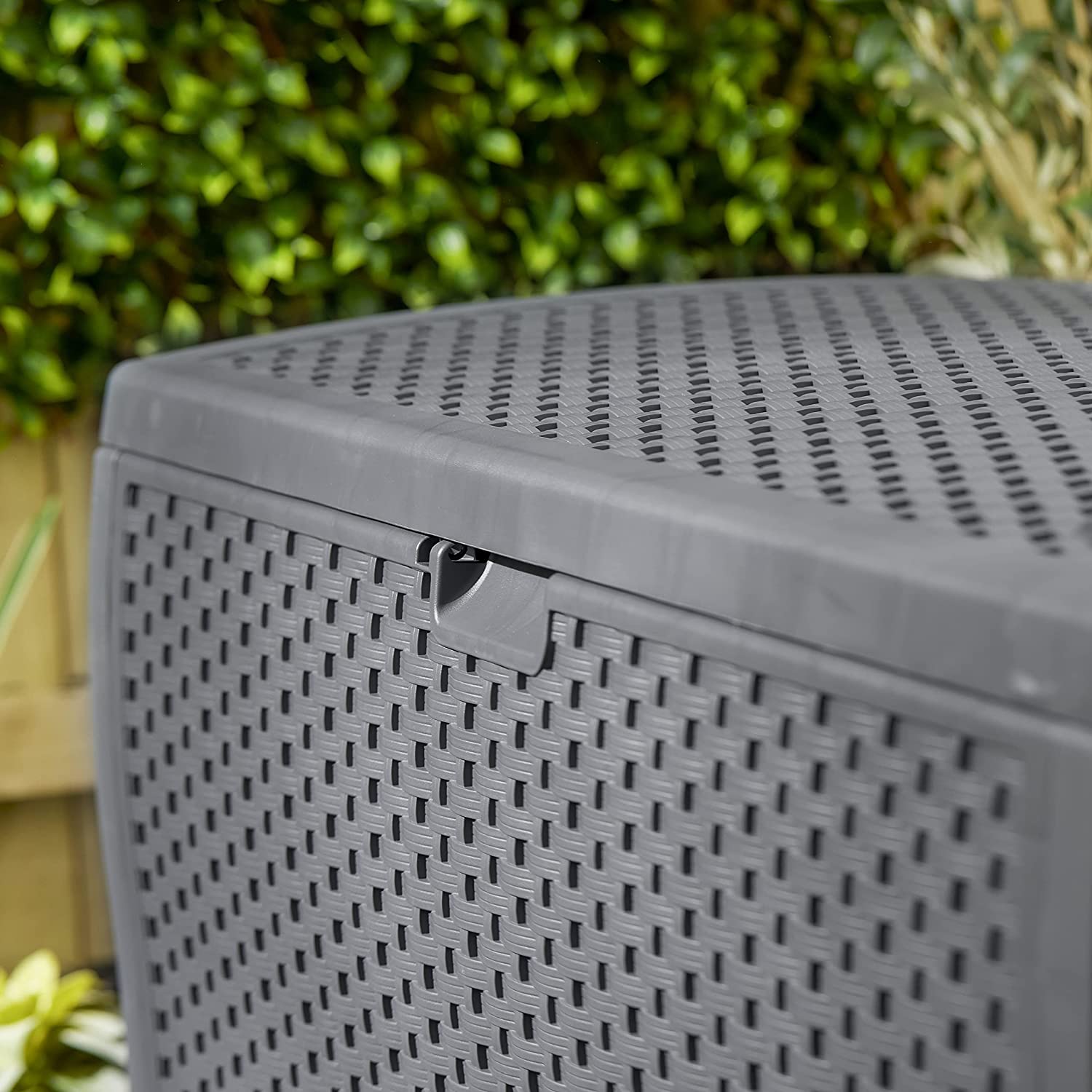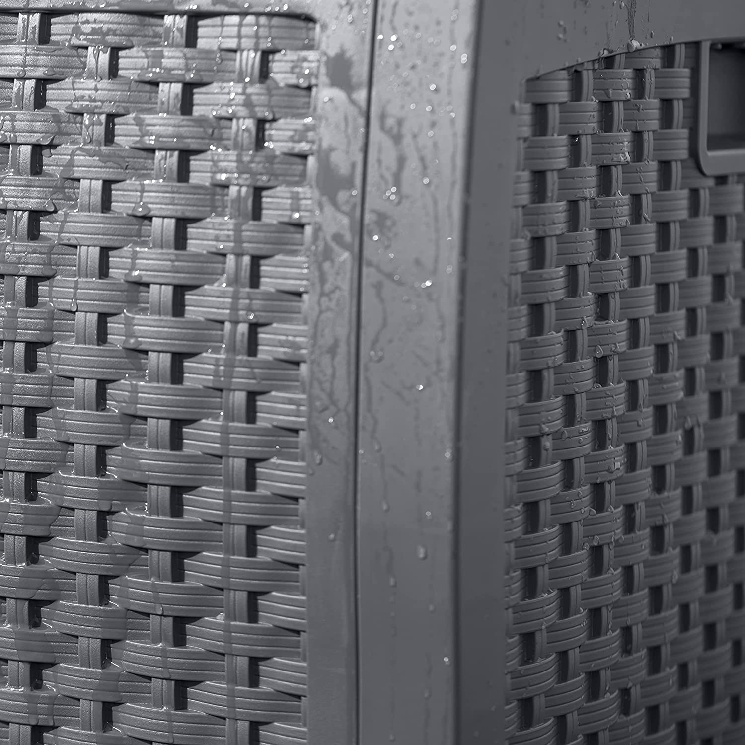 Suncast DBW7300C 73 Gallon Medium Resin Wicker Indoor/Outdoor Storage Box for Garden Tools. Pool Accessories. and Patio Cushions. Cyberspace