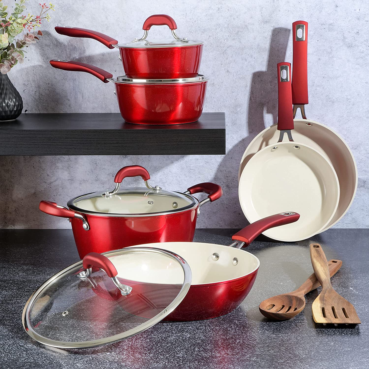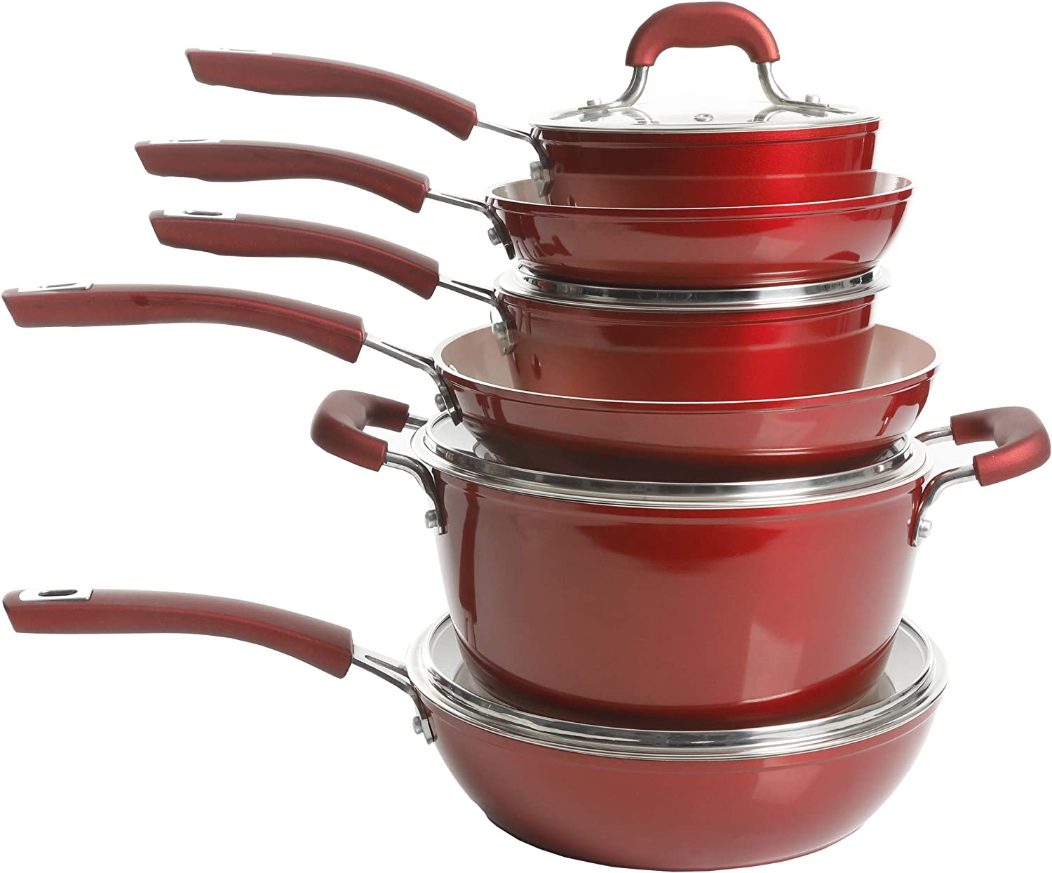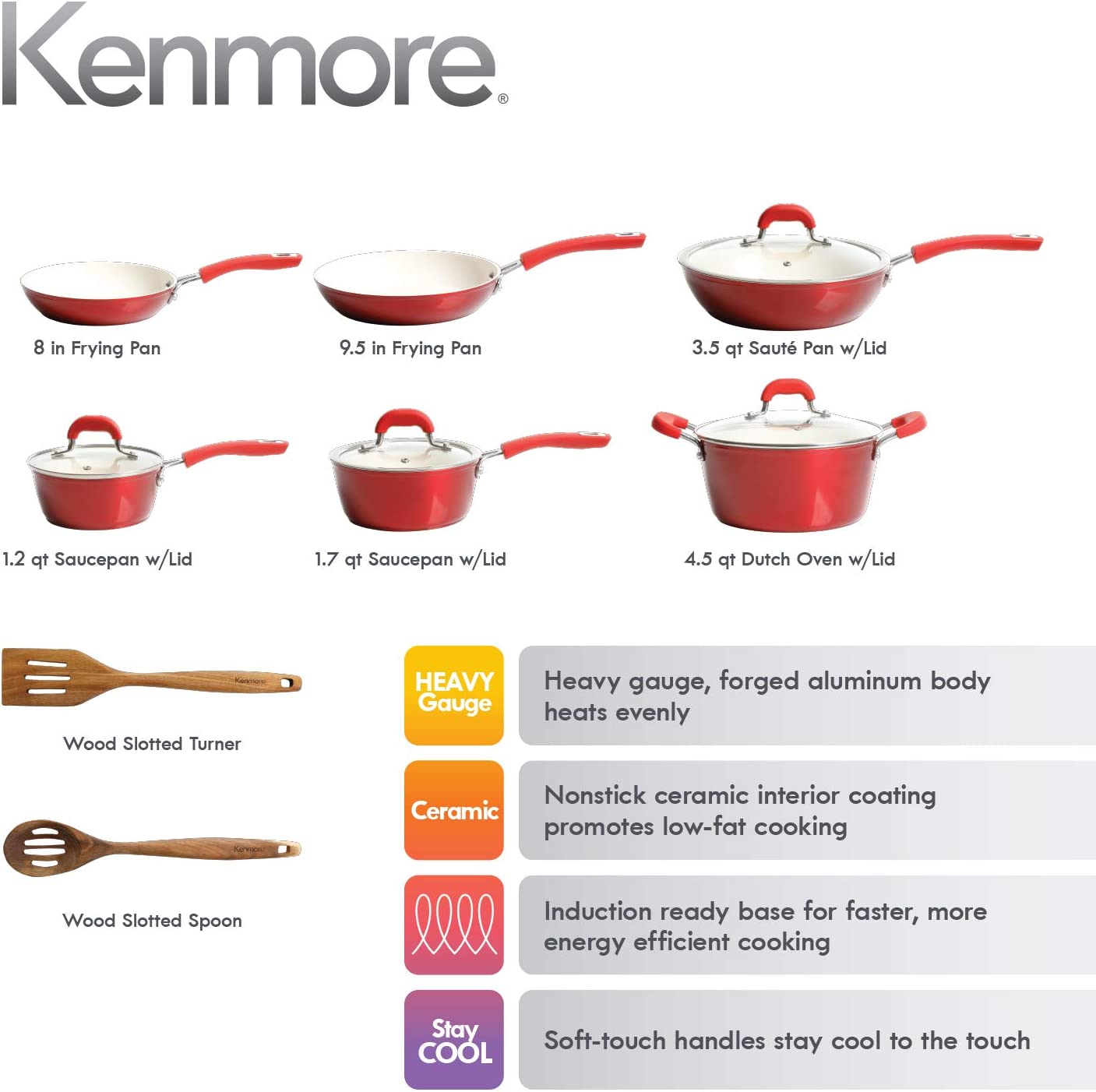 Kenmore Arlington Healthy Nonstick Ceramic Coated Forged Aluminum Induction Cookware. 12-Piece. Metallic Red