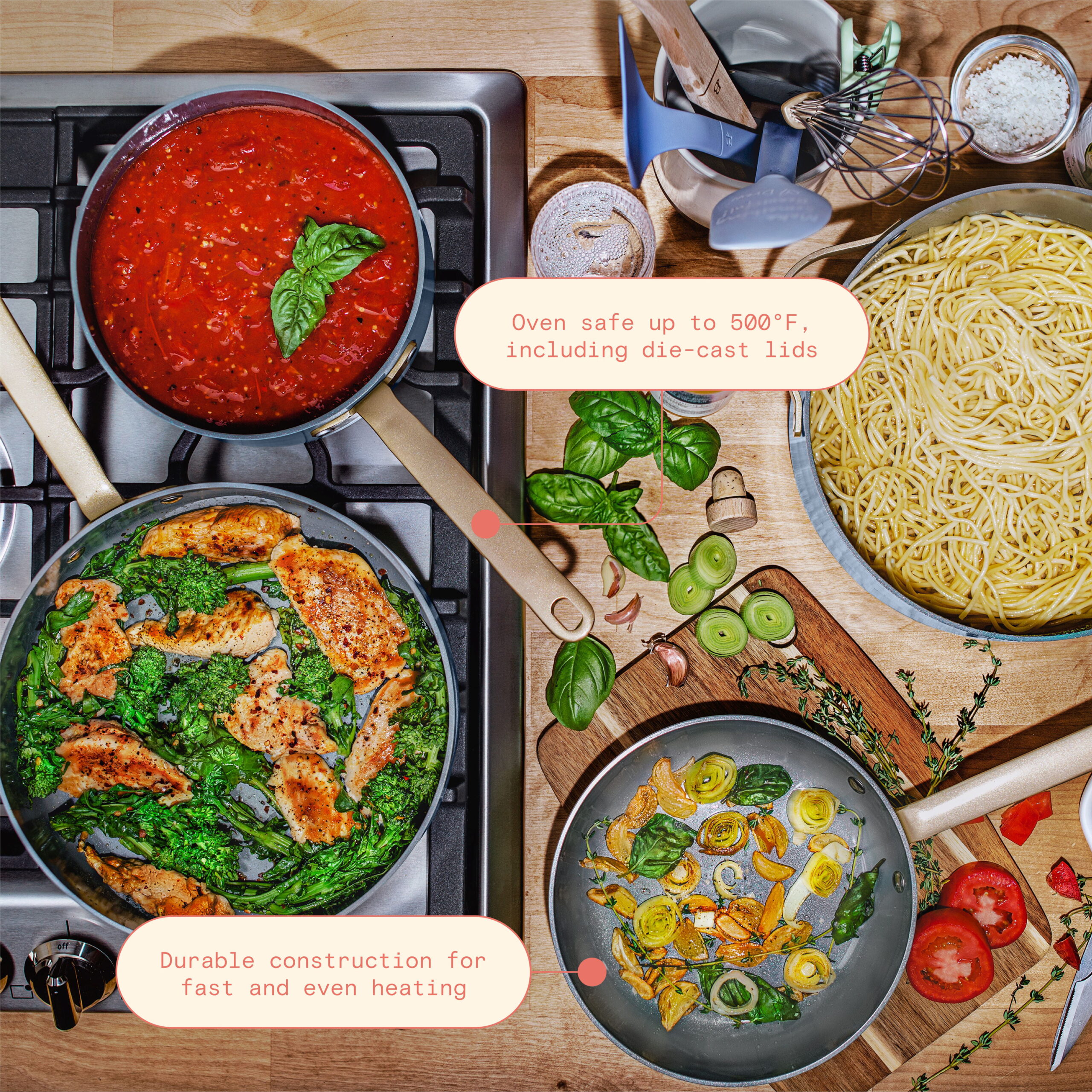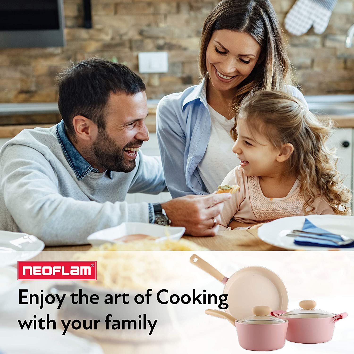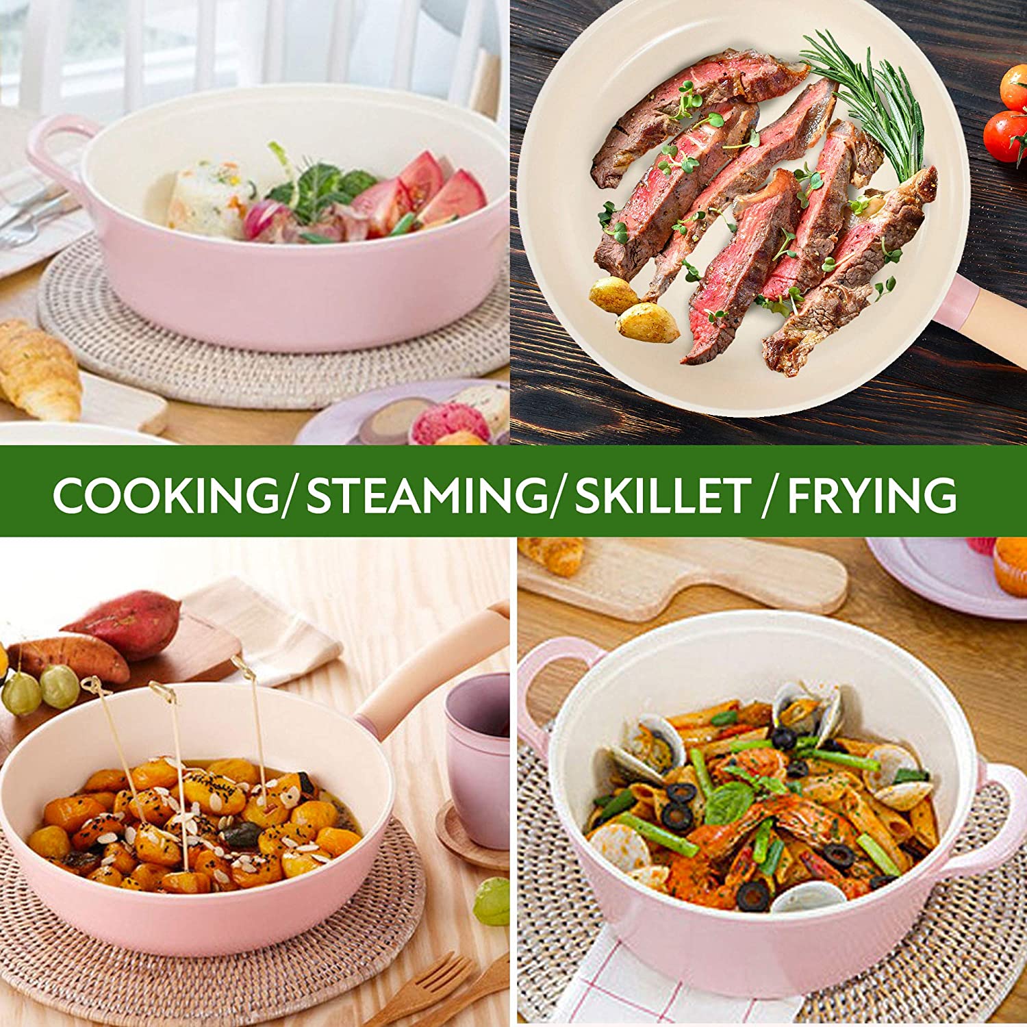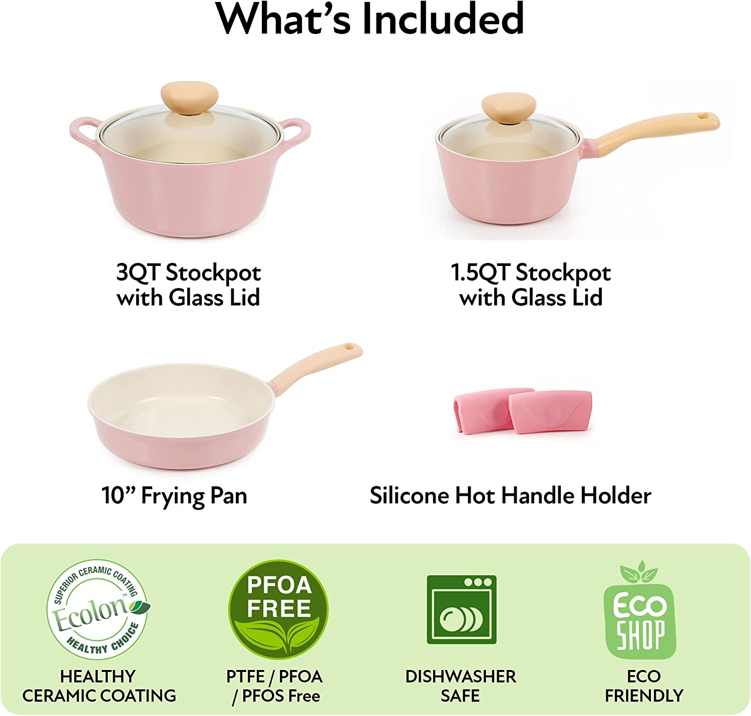 Neoflam Retro 5-Piece Ceramic Nonstick Cookware Set. PFOA Free Pots and Pans with Integrated Steam Vent Lid knob prevents boil over and Heat Resistant Silicone Grips for safer cooking at kitchen. Pink