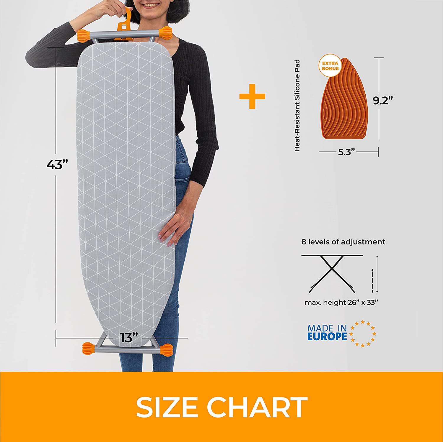 Bartnelli Ironing Board Made in Europe | Iron Board with 4 Layered Cover & Pad. Height Adjustable up to 36″ Features A Safety Iron Rest. 4 Steel Legs. for Home Laundry Room or Dorm Use (43×14)