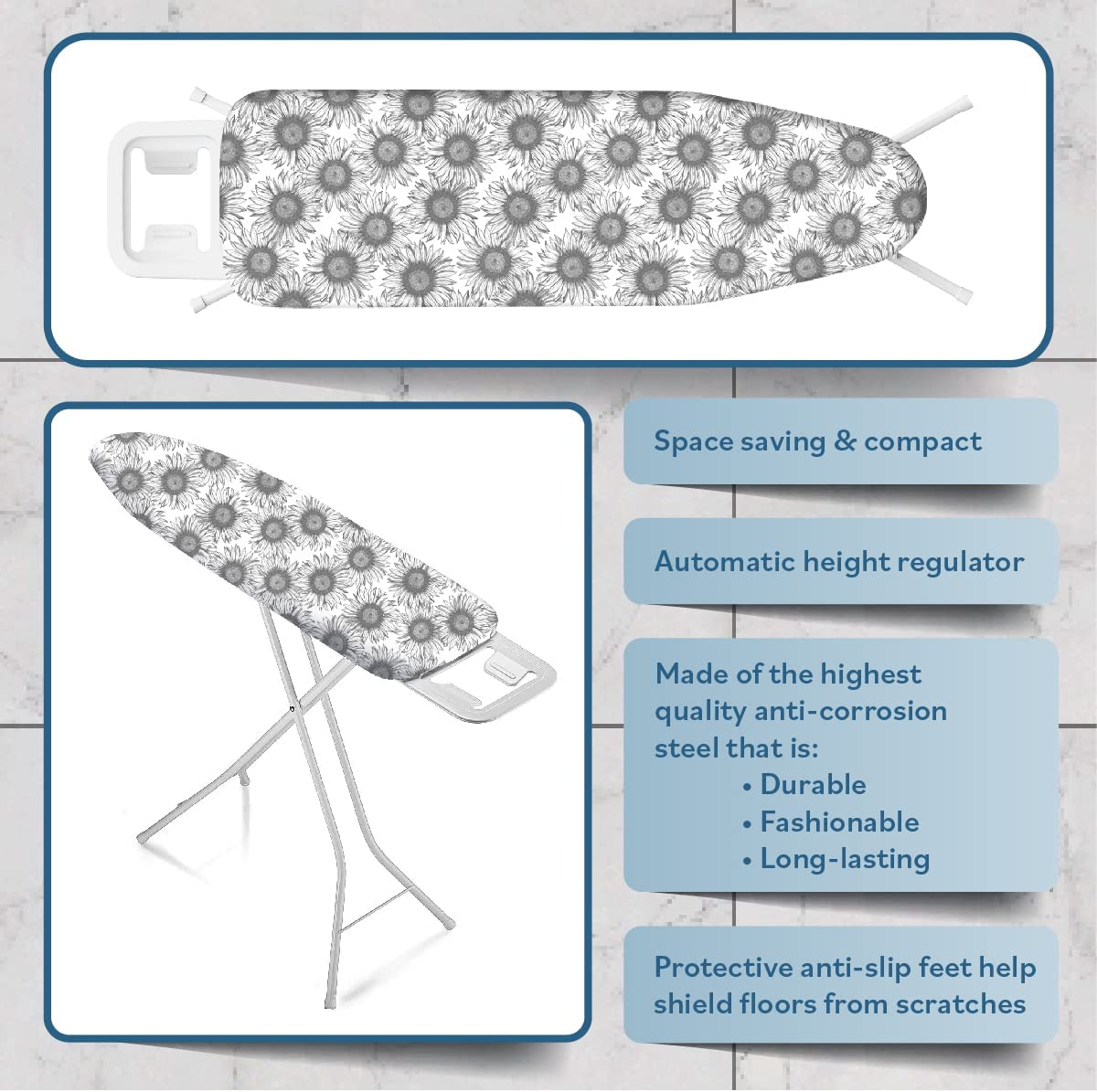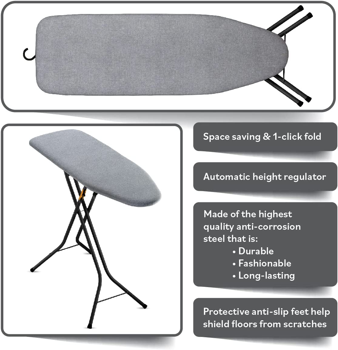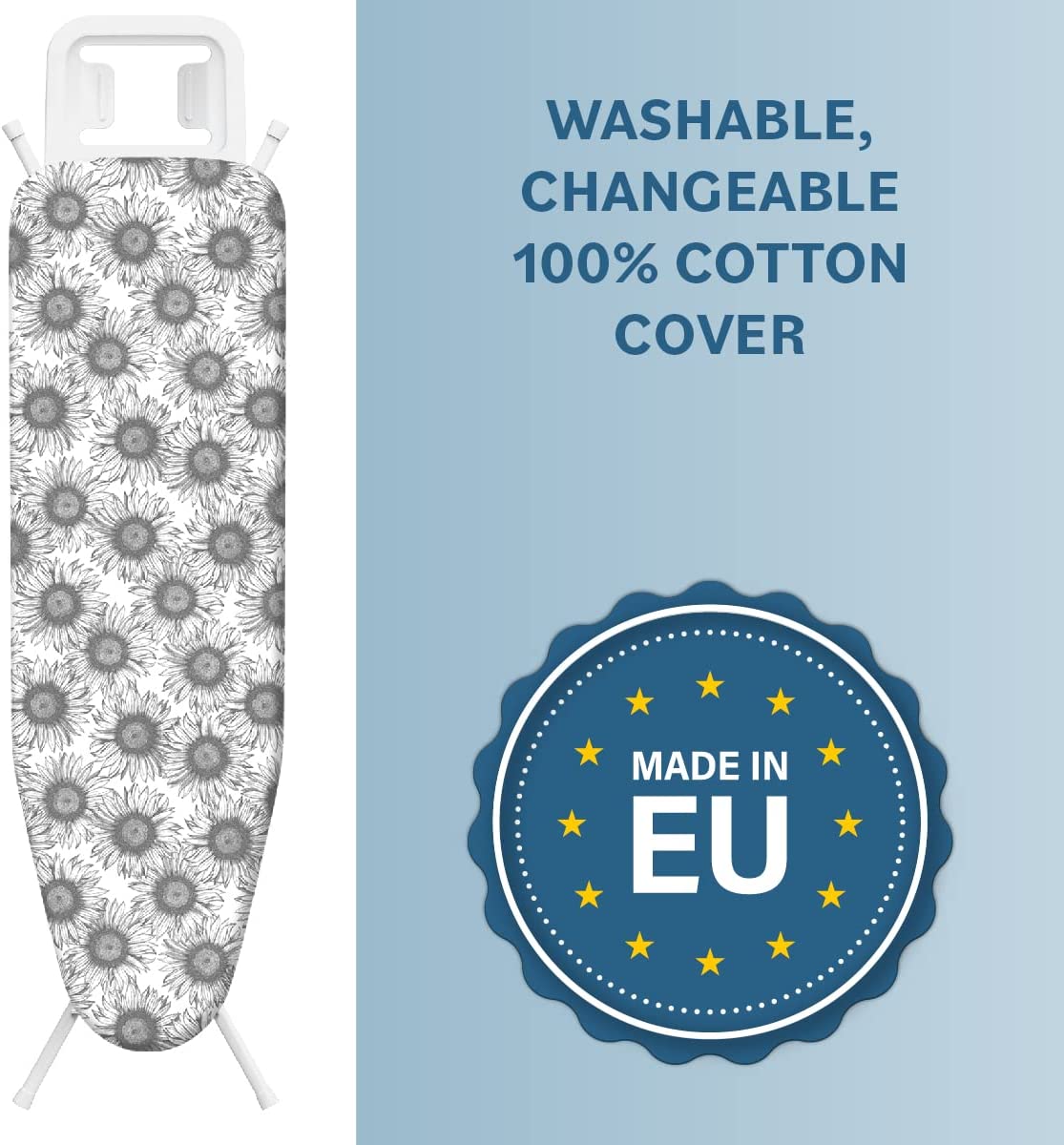 Bartnelli Ironing Board Made in Europe | Iron Board with 4 Layered Cover & Pad. Height Adjustable up to 36″ Features A Safety Iron Rest. 4 Steel Legs. for Home Laundry Room or Dorm Use.White / Grey (43×14)