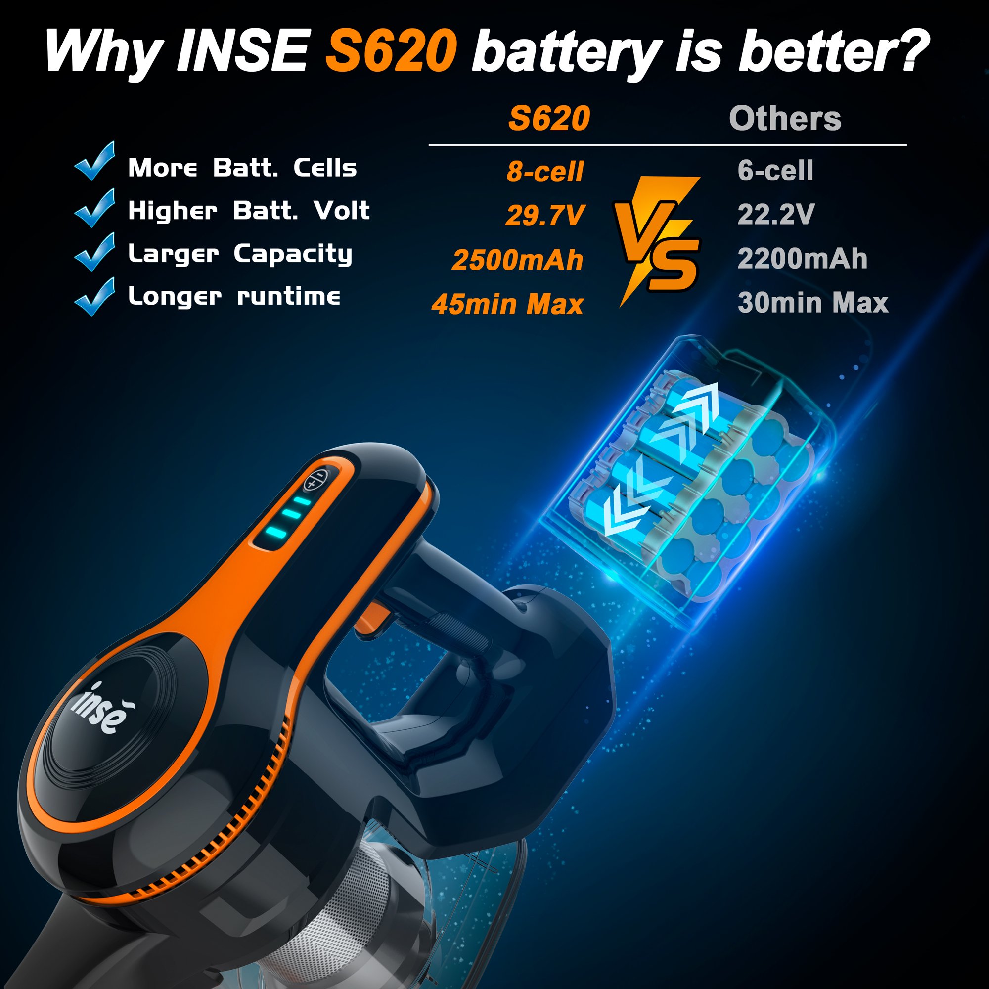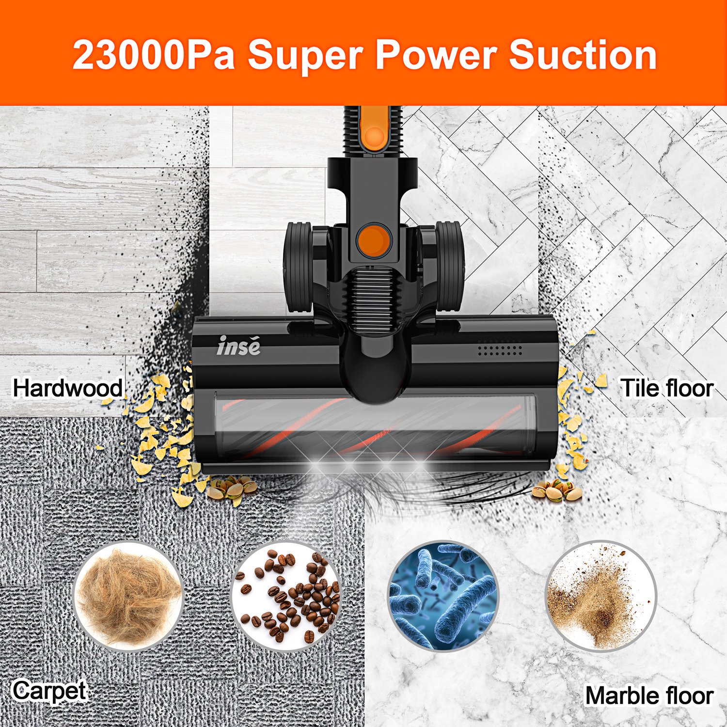 INSE Cordless Vacuum Cleaner. 23Kpa Strong Suction Stick Vacuum up to 45min Runtime Detachable Battery. Ultra Quiet Lightweight for Pet Hair Carpet Hard Floor
