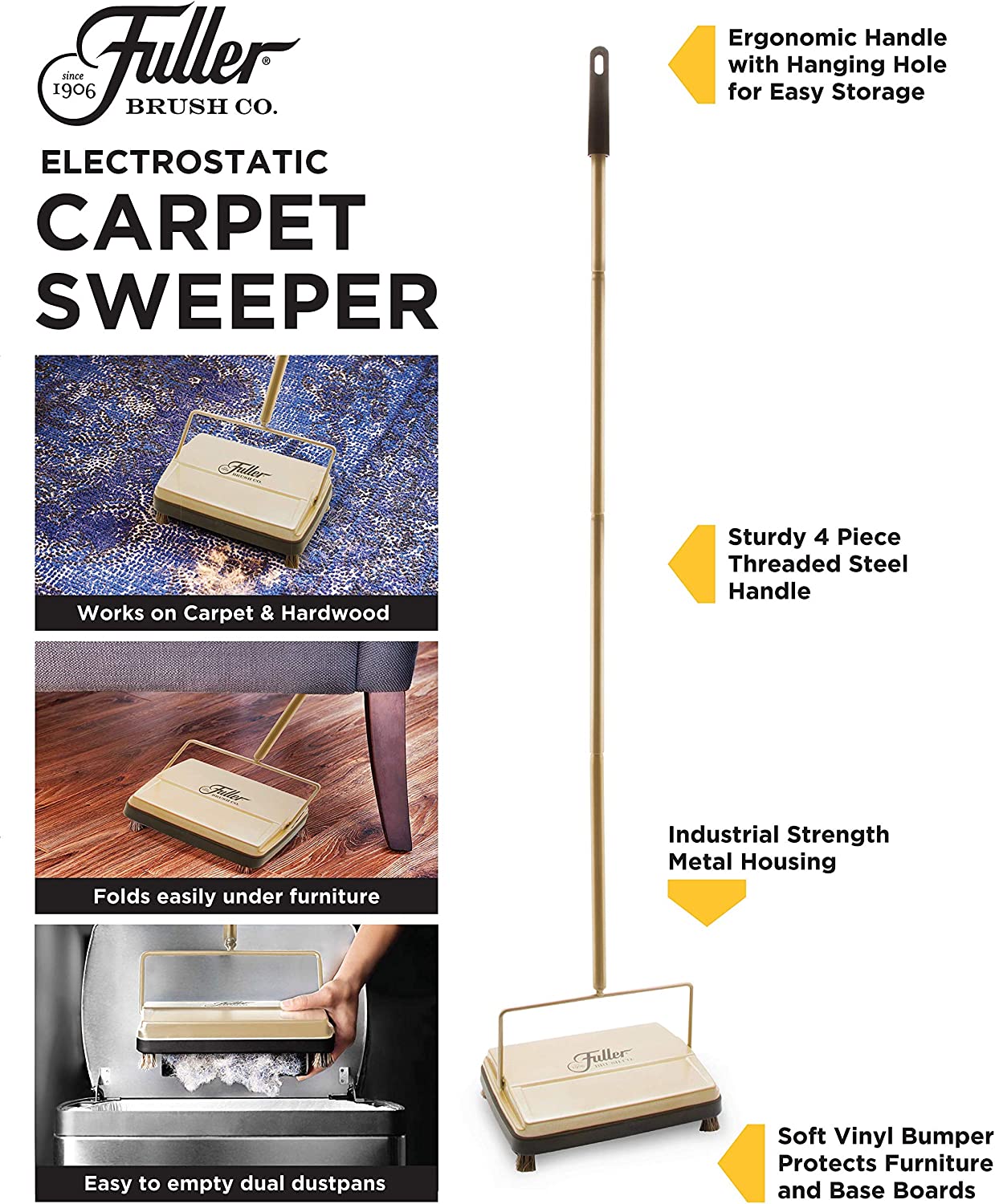 Fuller Brush 17031 Electrostatic Carpet & Floor Sweeper - 9″ Cleaning Path - Lightweight - Ideal for Crumby Messes - Works On Carpets & Hard Floor Surfaces - Rich Gold