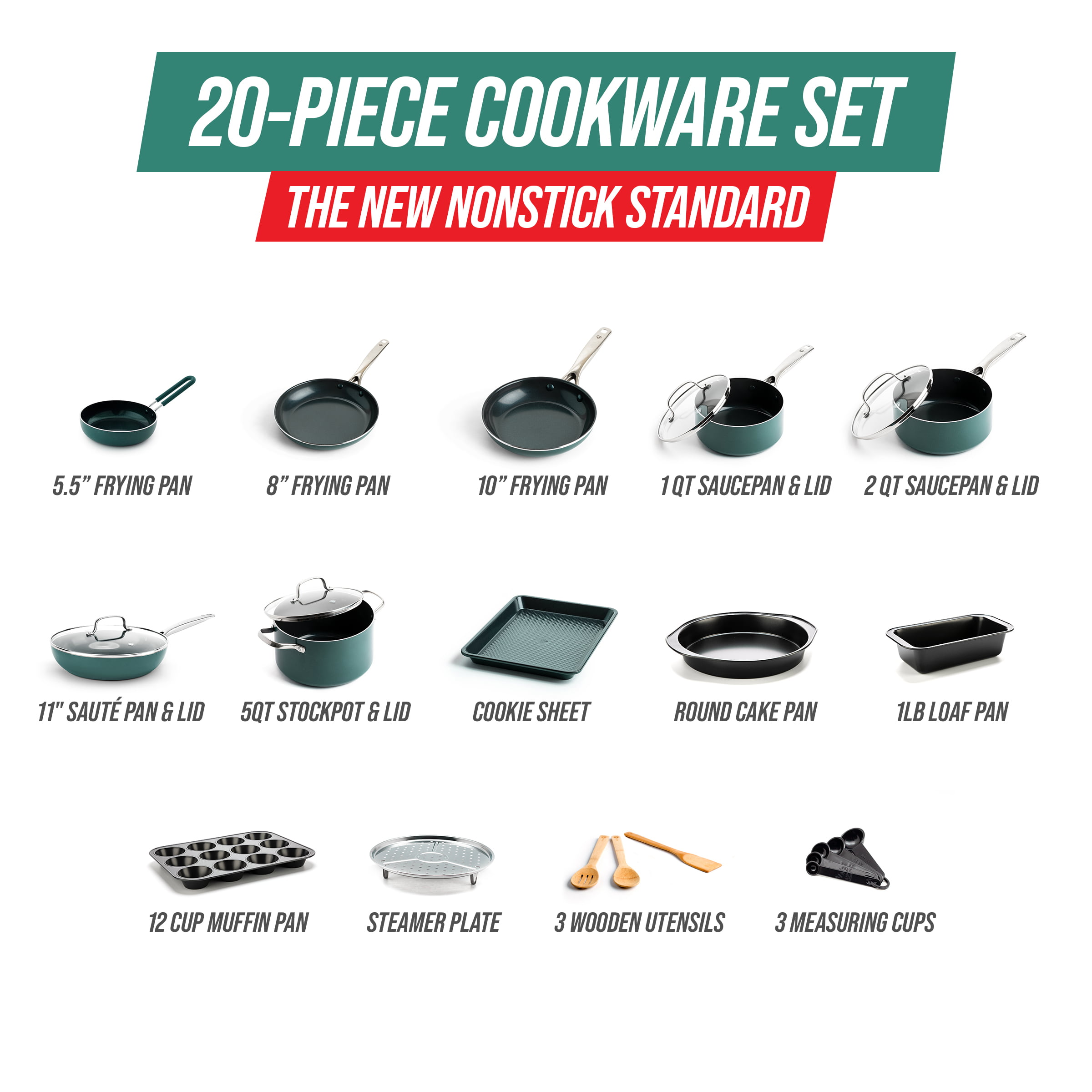 Blue Diamond Green Diamond 20pc Cookware Set. Green