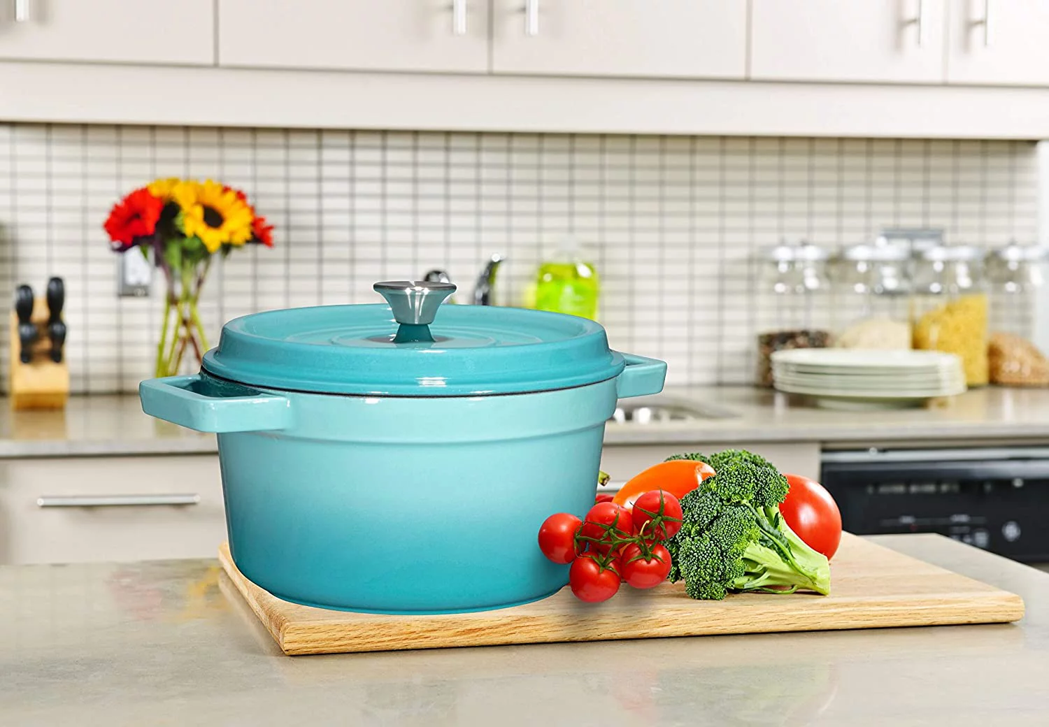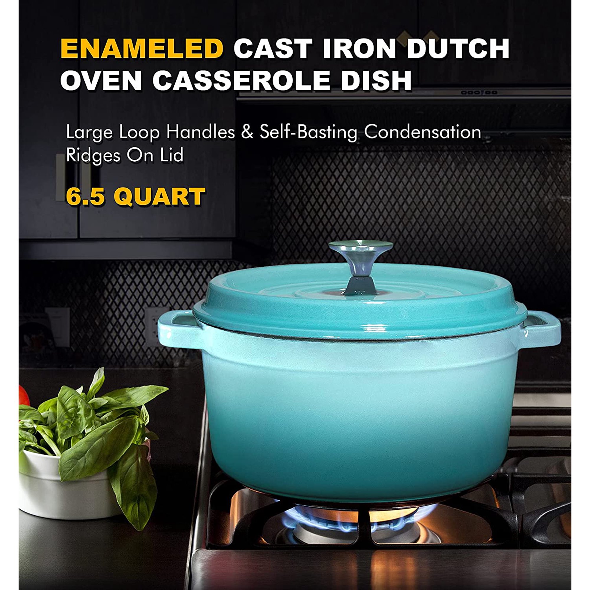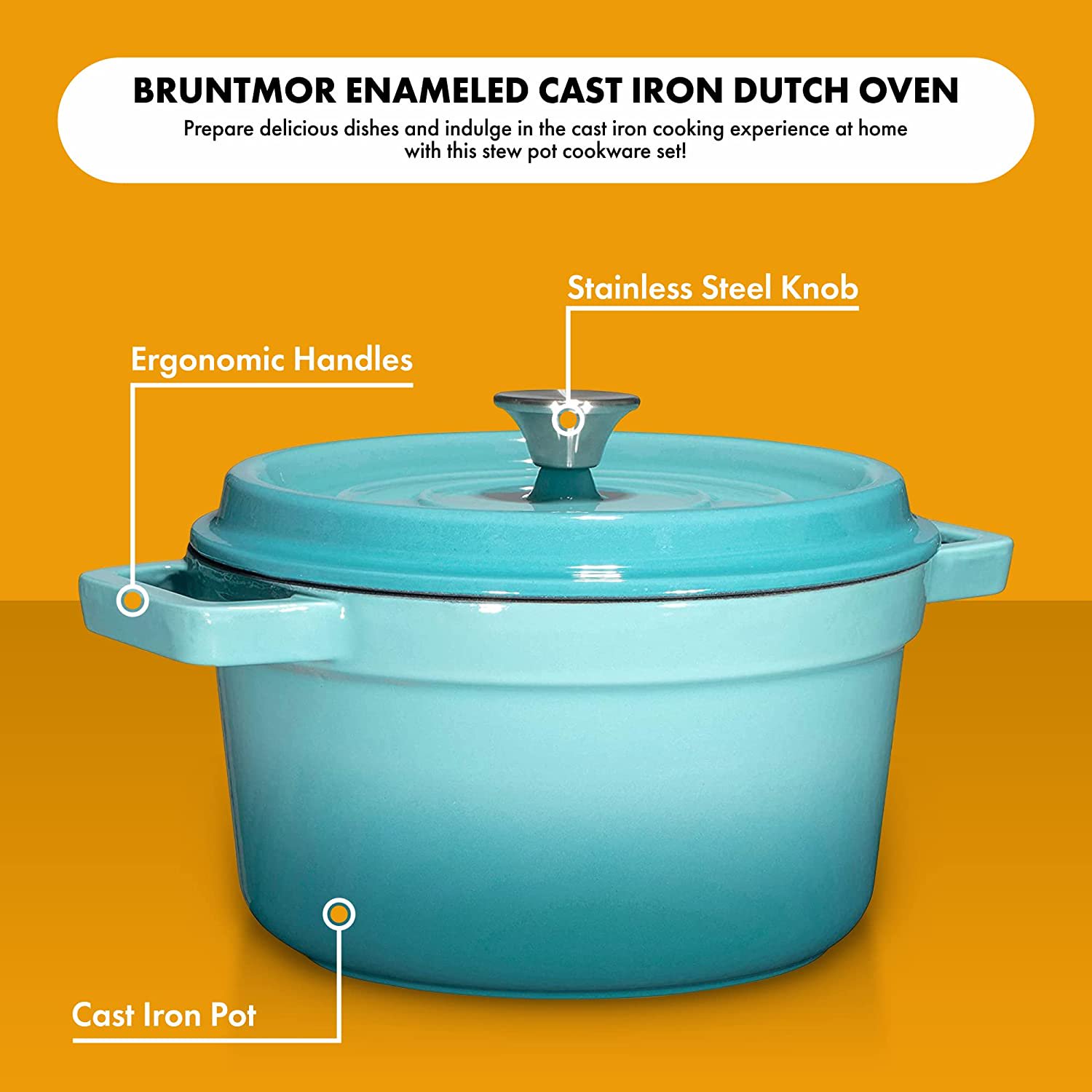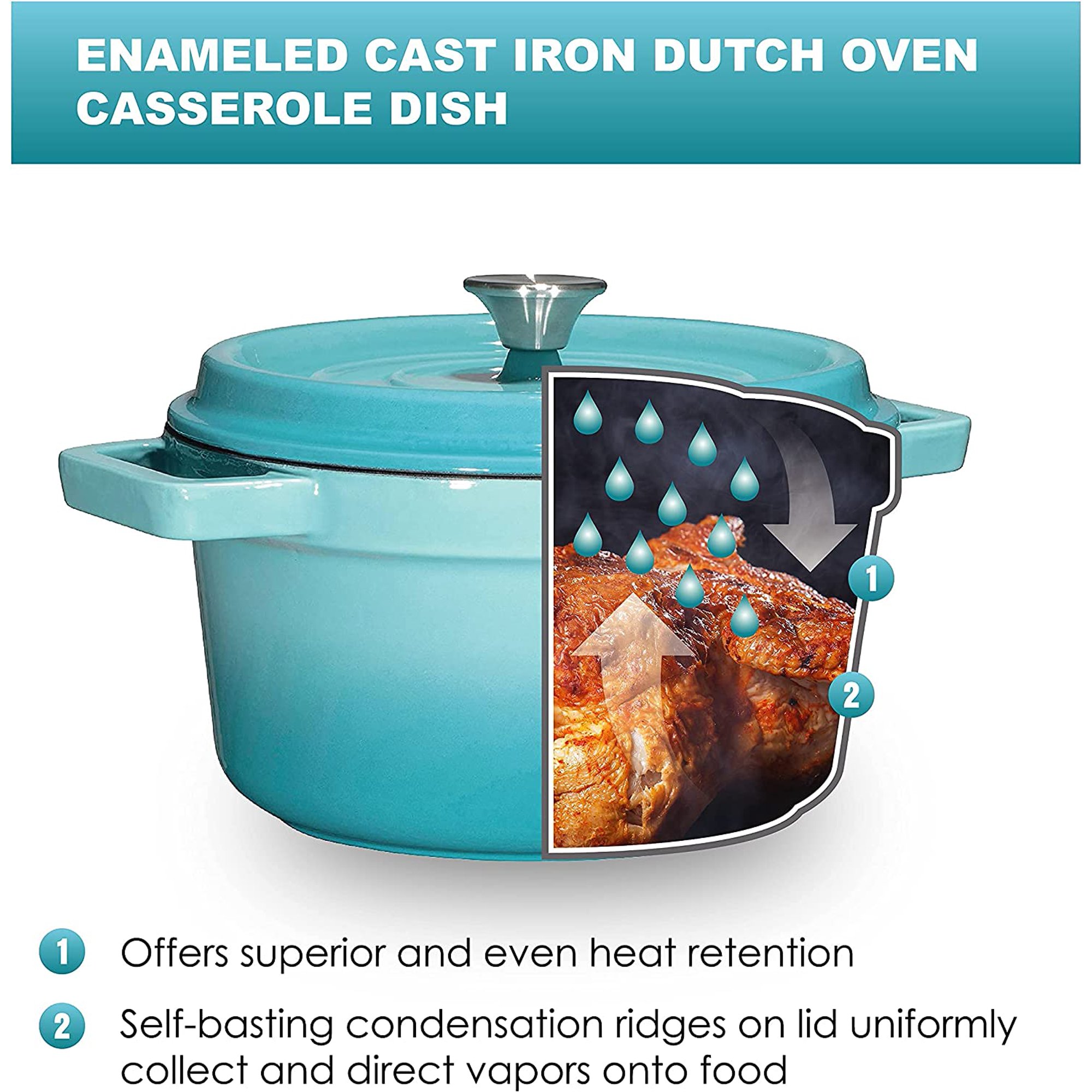 Bruntmor Enameled Cast Iron Dutch Oven Casserole Dish 6.5 Quart Large Loop. 16.45 lbs W. Round (Turquoise)