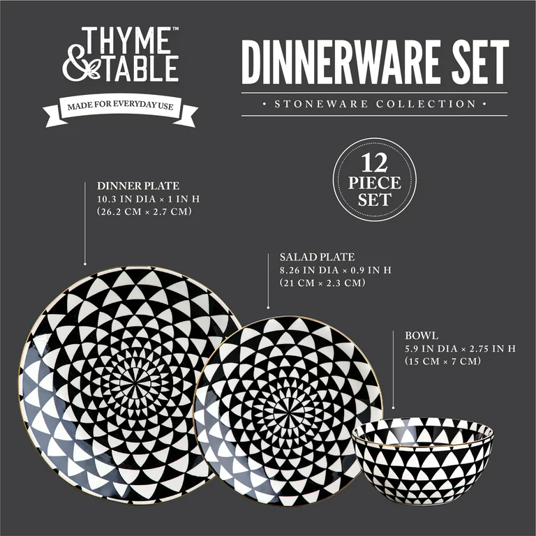 Thyme & Table Dinnerware Black & White Medallion Stoneware. 12 Piece Set