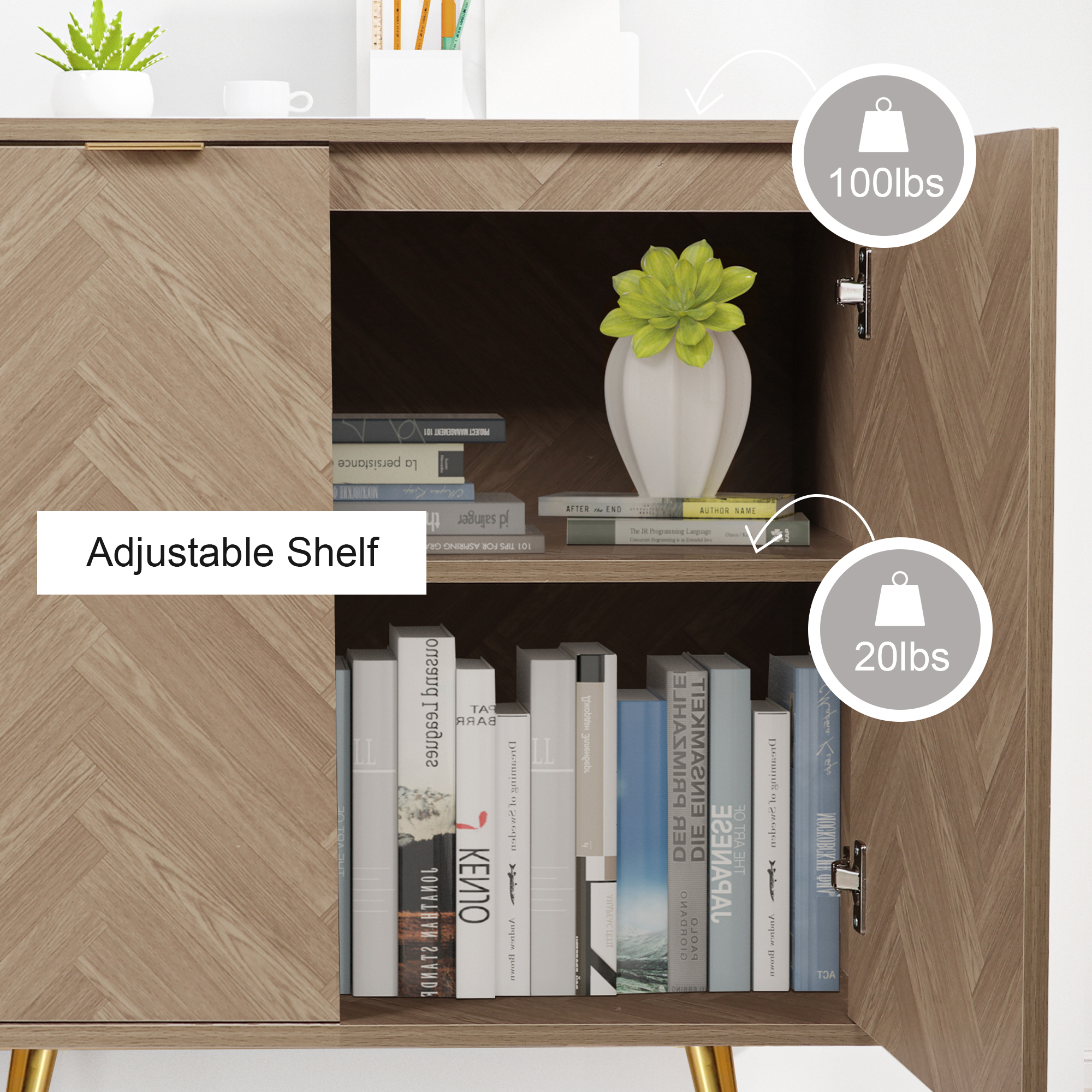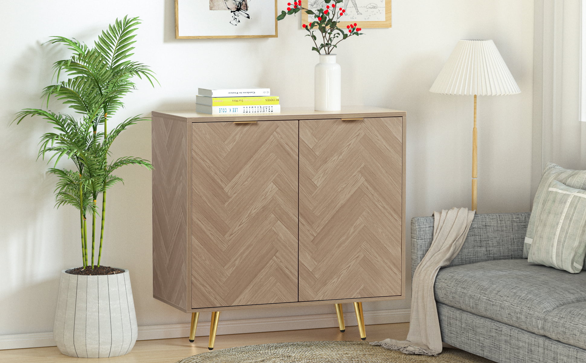 Eumyviv Sideboards and Buffet with 2 Doors. Natural Oak Accent Cabinet Herringbone Finished. Storage Cabinet for Living Room. Bedroom. Kitchen. H0058